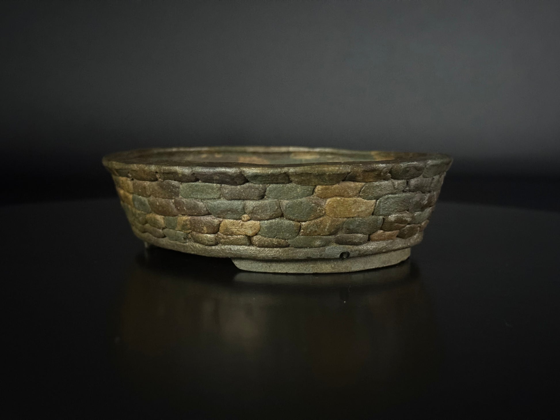 A vintage artisan-made oval bonsai pot (楕円鉢, daen-bachi) with a unique ishigaki (石垣, stone wall) carved exterior. The craftsmanship captures the natural feel of stacked stonework, giving the pot a rustic and timeless wabi-sabi (侘寂) atmosphere. Featuring an internal rim (内縁, naien), slightly elevated cut feet (切足, kiri-ashi), and excellent subtle color variation in the groggy clay body. The earthy tones range from muted greys to warm browns and mossy greens, enhancing its natural stone appearance. A rare example of Shimizu Toshishige’s distinctive handwork, ideal for both display and use.