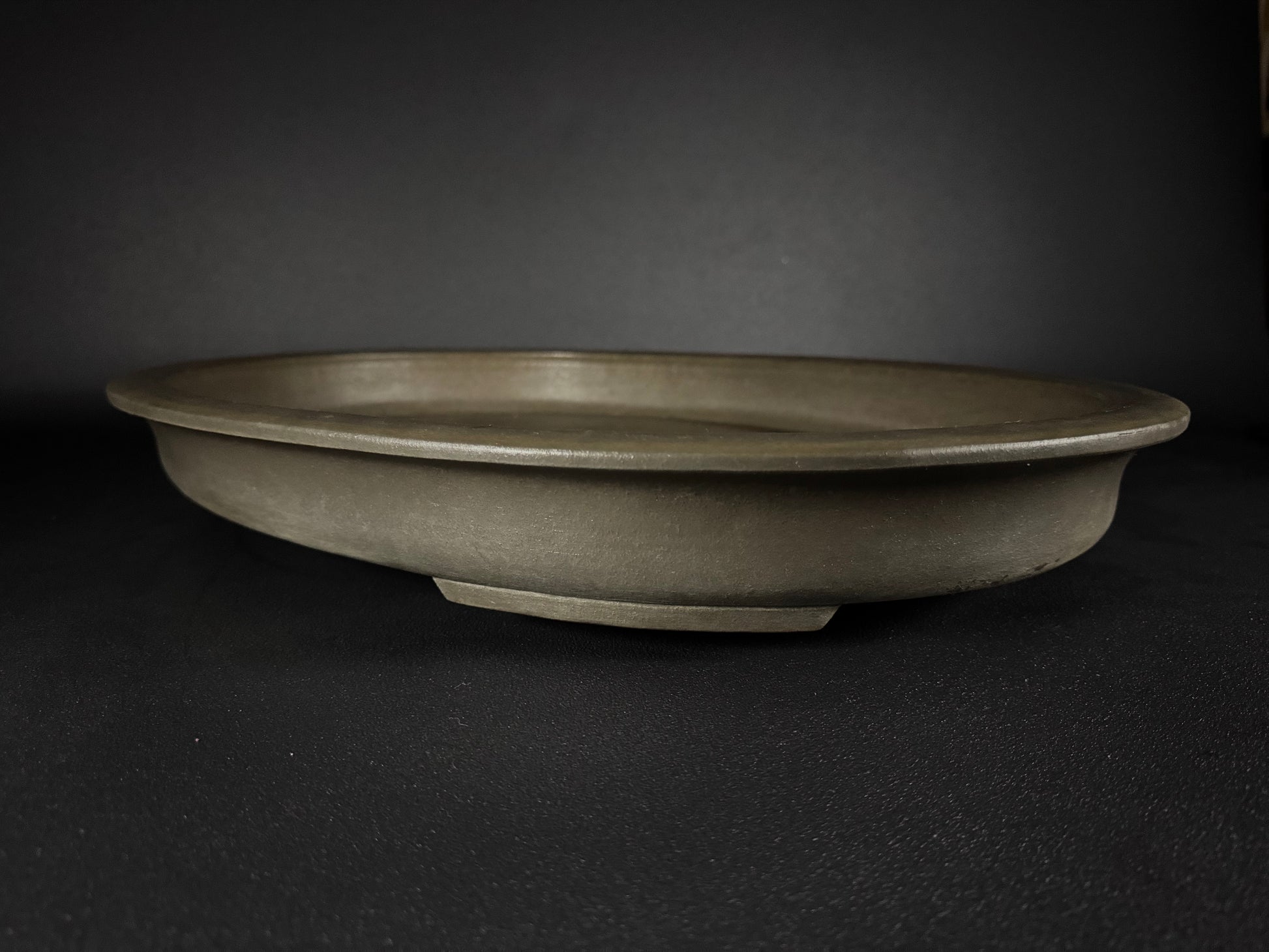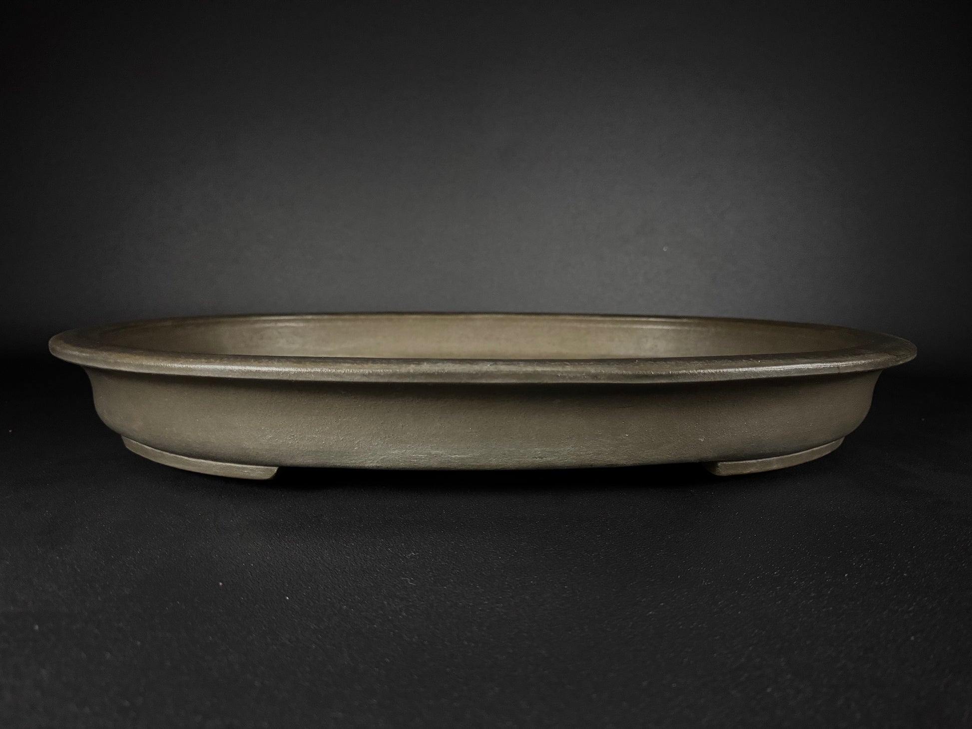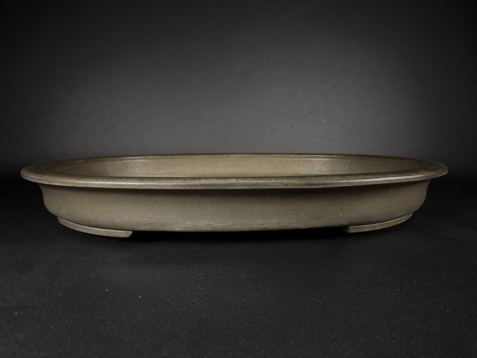 This vintage artisan-made Japanese bonsai pot showcases an elegant oval form, distinguished by the finely crafted details that speak to the potter's expertise. The unglazed surface reveals a subtle, earthy tone, perfectly capturing the "shibui" aesthetic of understated beauty. The walls of the pot feature a slightly flared design, with a gently rounded lip that adds a sense of refinement.