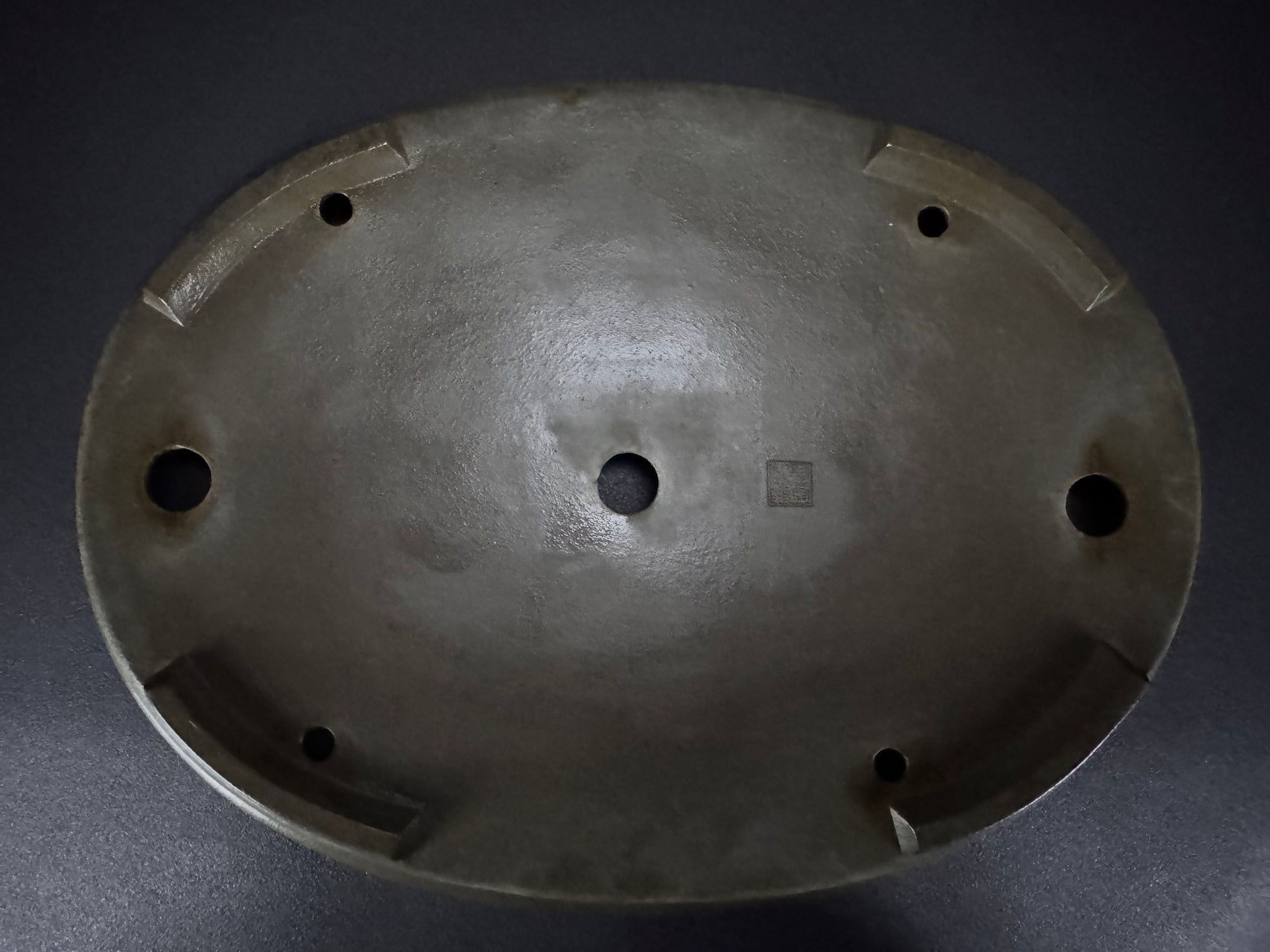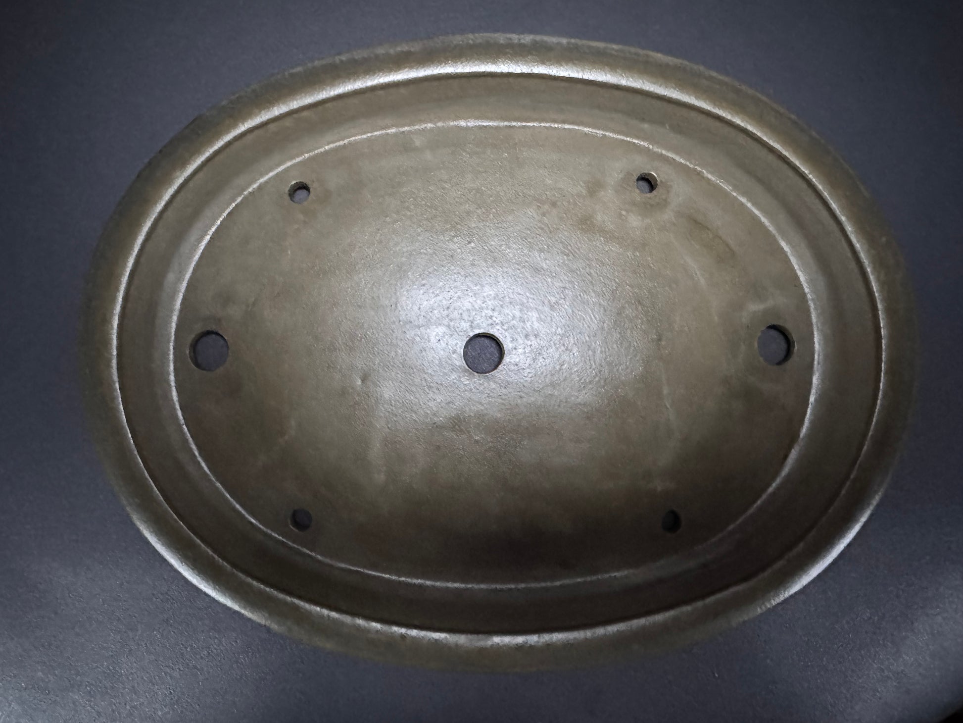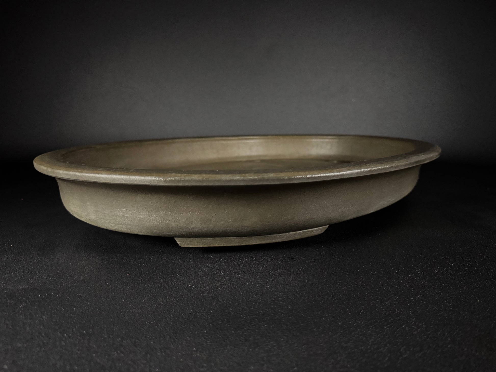 This vintage artisan-made Japanese bonsai pot showcases an elegant oval form, distinguished by the finely crafted details that speak to the potter's expertise. The unglazed surface reveals a subtle, earthy tone, perfectly capturing the "shibui" aesthetic of understated beauty. The walls of the pot feature a slightly flared design, with a gently rounded lip that adds a sense of refinement.