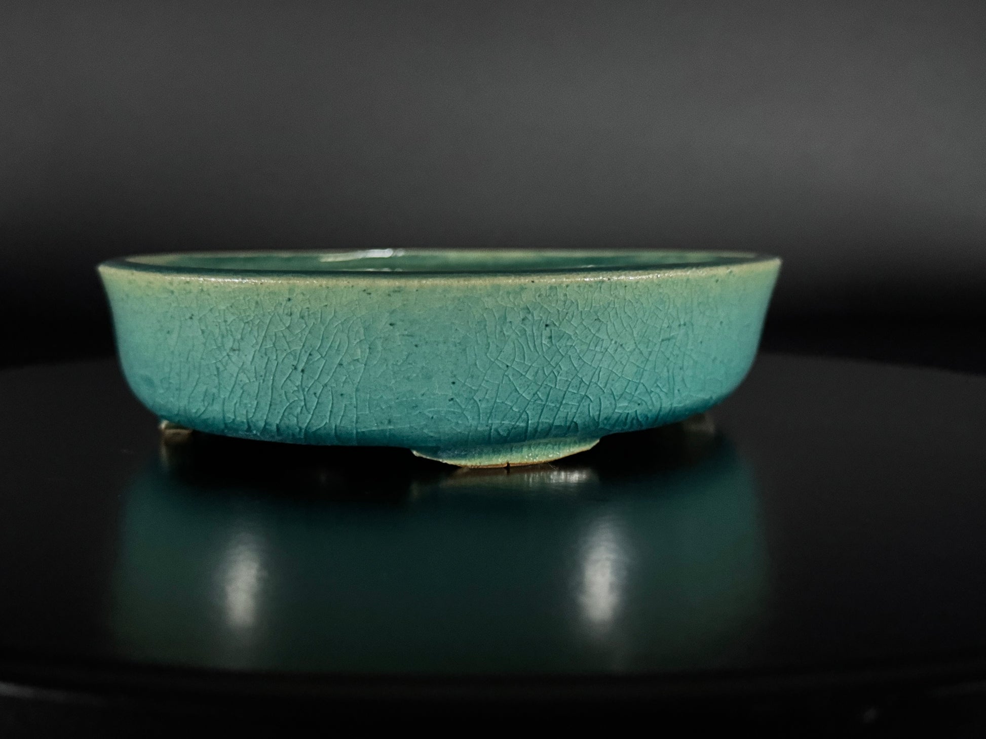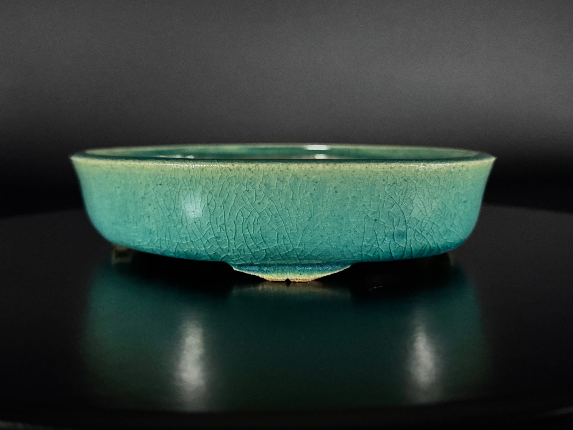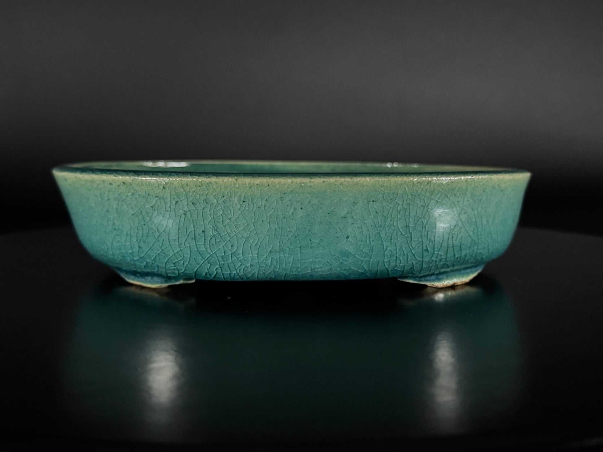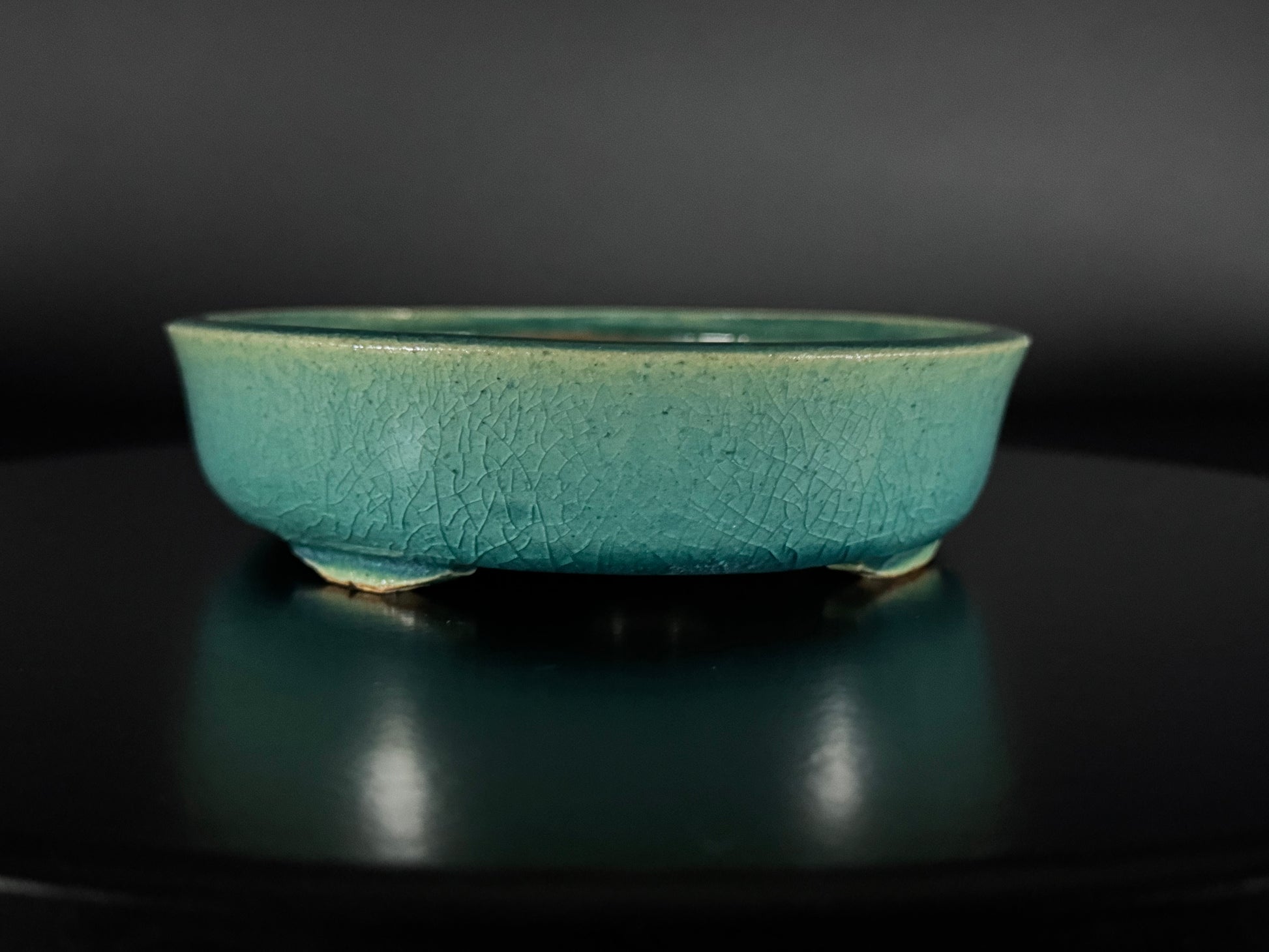 An elegant nagamé maru 長楕円 (oval) bonsai pot by Fuuka (風香), finished in a translucent seiji 青磁 (celadon) glaze with fine kannyū 貫入 (crackle). The smooth, flowing lip (uchi-buchi 内縁) gives a gentle softness, while the delicate maru-ashi 丸足 (rounded feet) lift the pot with subtle grace. The pale, finely textured clay body contrasts beautifully with the glossy celadon rim, a hallmark of Fuuka’s refined shohin 小品 work. With clean drainage (soko-ana 底穴) and wire holes (kake-ana 針金穴), this pot is both highly functional and artistically balanced — perfect for accentuating a small deciduous tree or flowering bonsai.