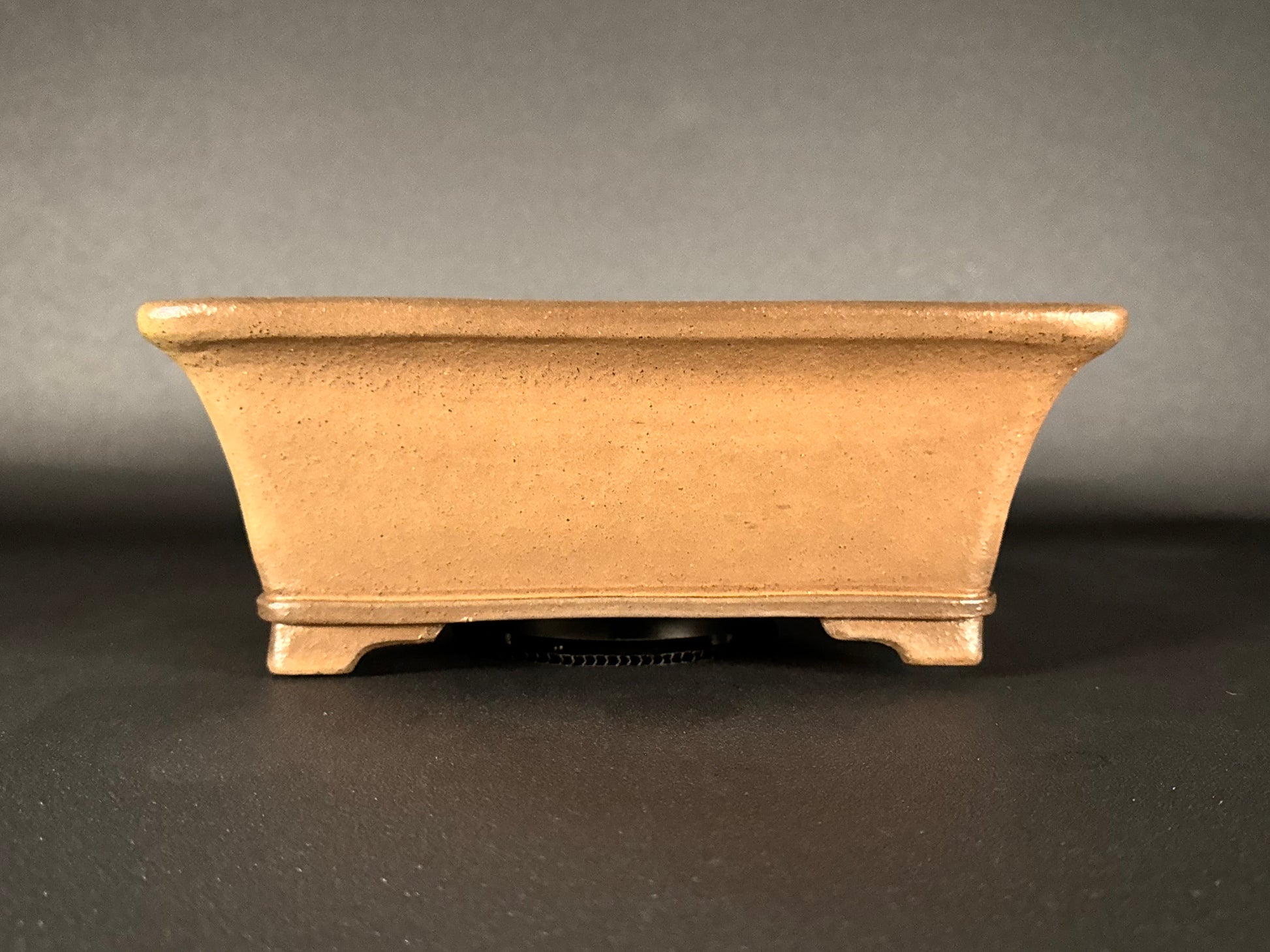 This medium-sized, unglazed, rectangular bonsai pot exemplifies the artistry of Gyouzan. Hand-crafted with precision, it features a soft mokkō (木瓜) influenced form with slightly flared walls and a distinctive raised lip (縁, fuchi). The lip is echoed by a refined raised border that flows seamlessly into recessed, stepped feet (段足, dan-ashi), lending both structure and vertical rhythm to the design.