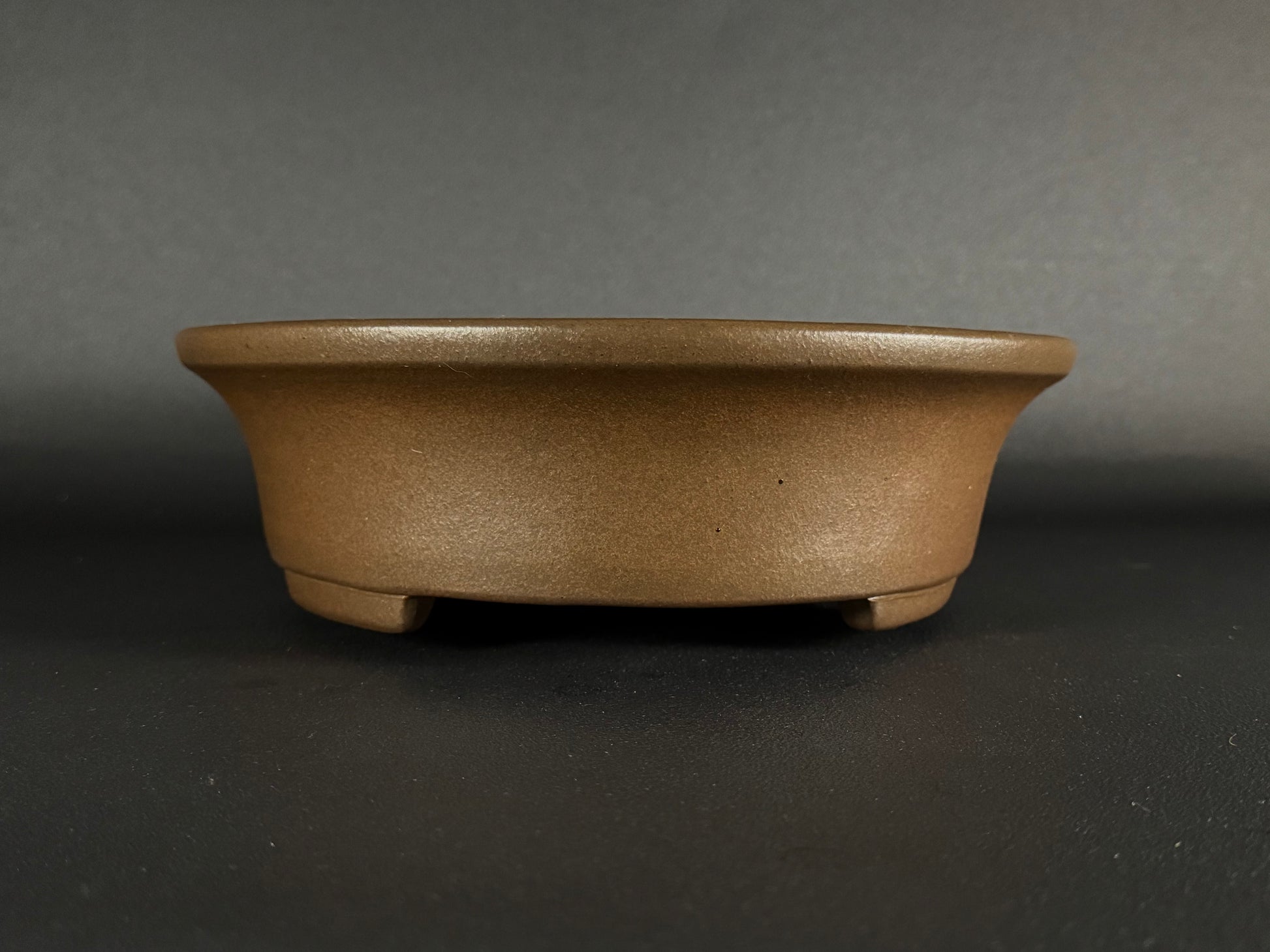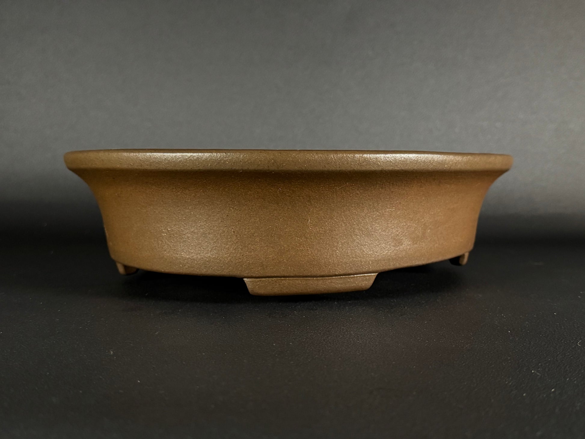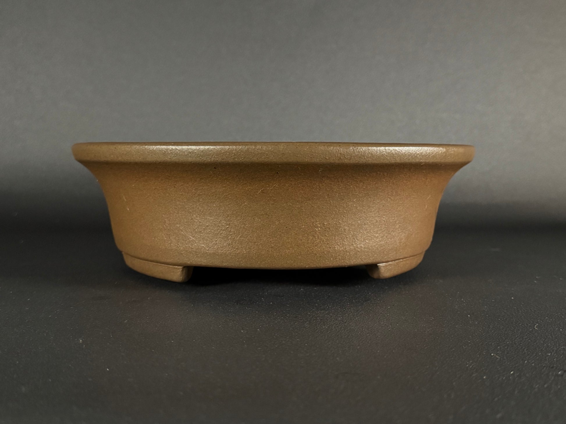 This exquisite bonsai pot was crafted by Nakano Yuuji, the second-generation potter at the Gyouzan kiln in Tokoname. The design is a medium-sized oval, unglazed to showcase the natural beauty of the clay. It features slightly recessed round-cut feet, and the raised lip detail complements the overall Shibui (渋い) design, embodying simplicity and understated elegance.
