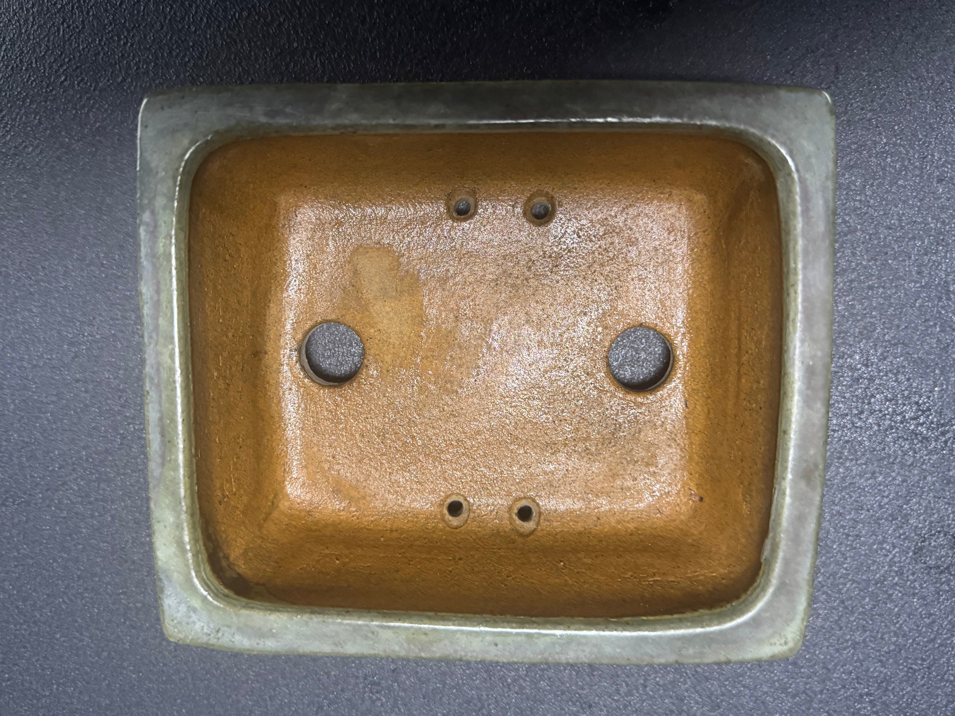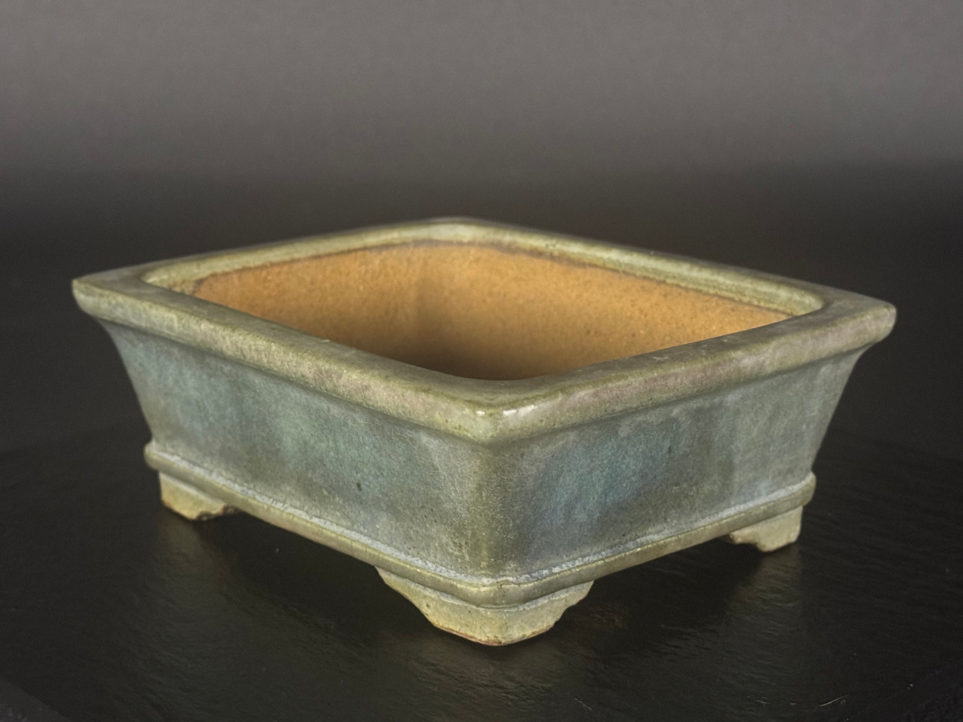 A soft, blue/green glazed rectangle, in a traditional style, yet the angle of the corners are very smooth, rather than sharp edges, the pot sits on slightly recessed stepped feet, with basal banding and a slight lip to the rim, complementing the overall 'shibui'