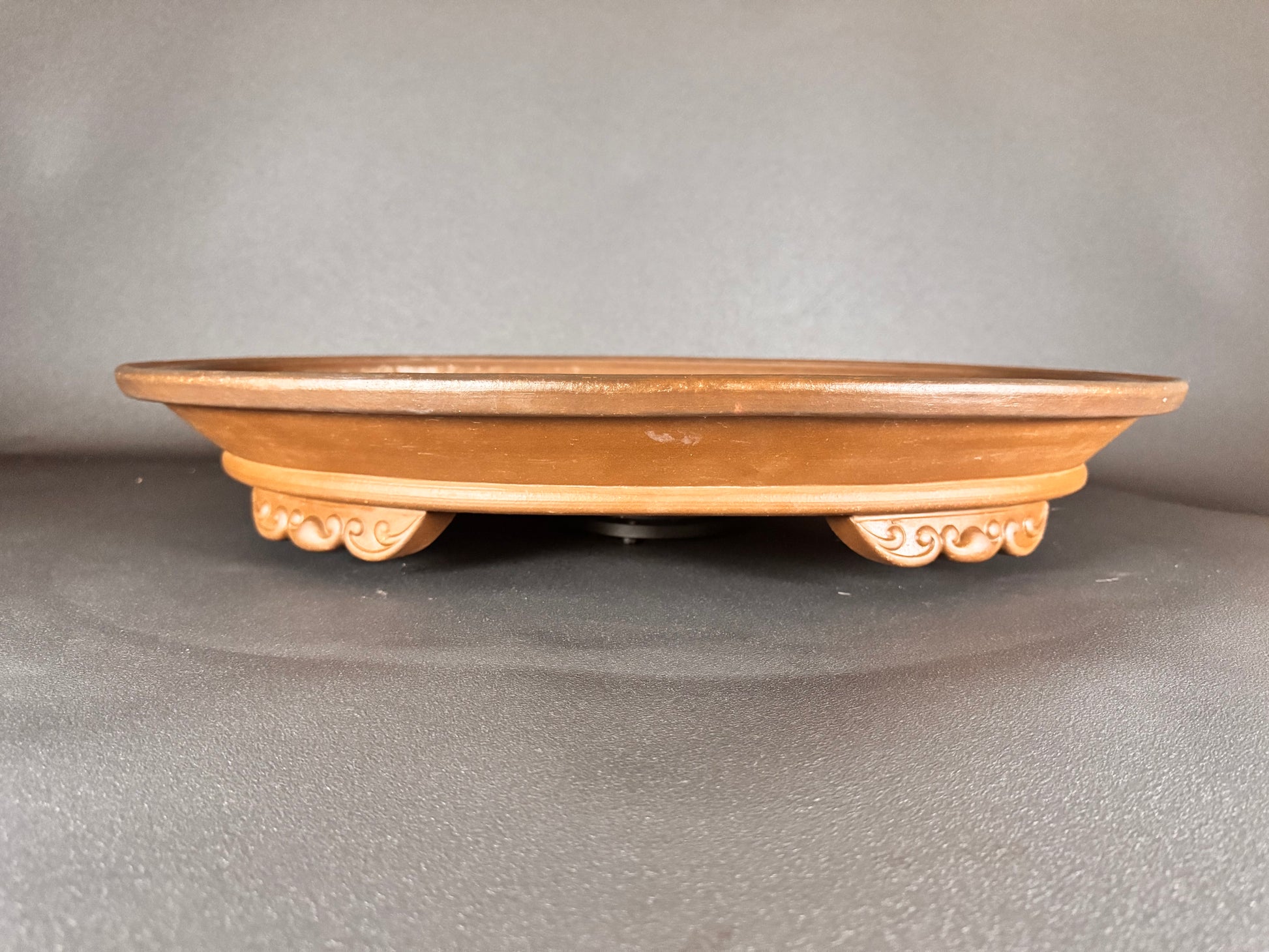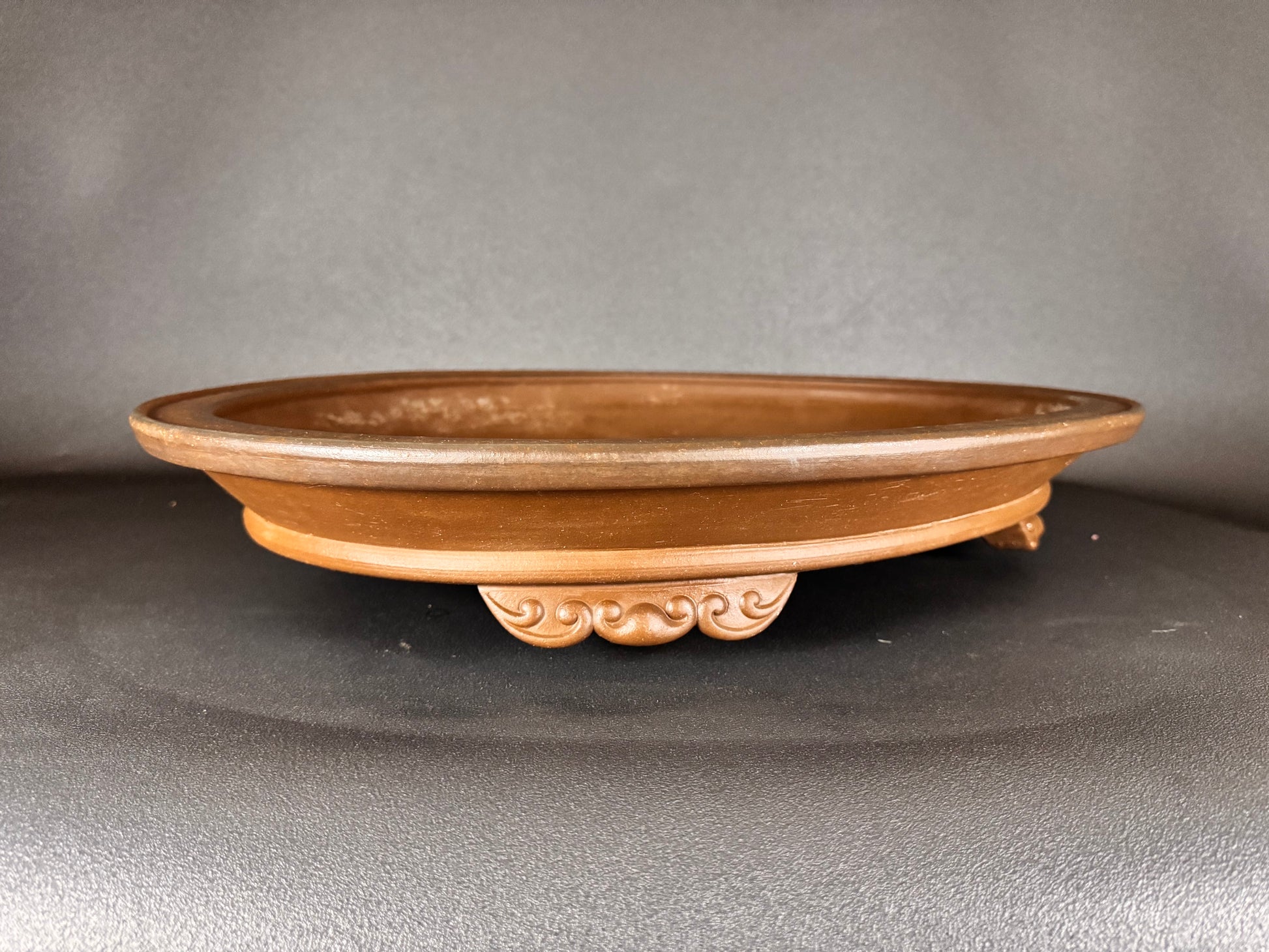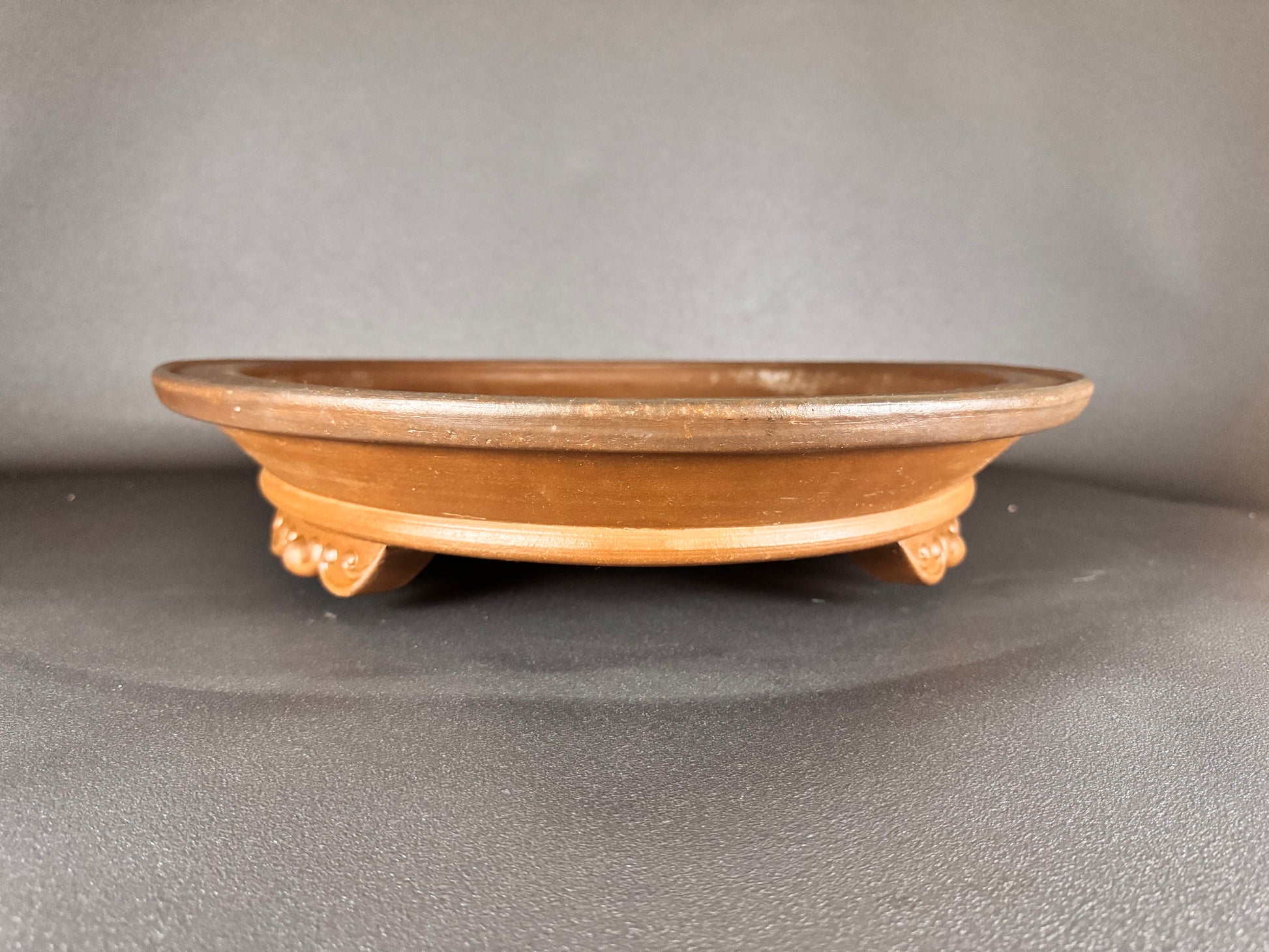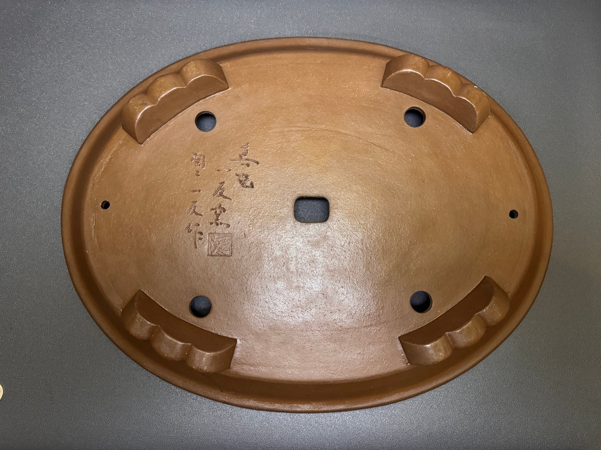 A stunning antique bonsai pot, made by Ichiyu友, it reflects skilled craftsmanship and traditional Japanese aesthetics in classic oval “nagamaru” shape, with a well-balanced silhouette. It features an inner rim, with a slightly raised and rounded outer lip, which is finished with a refined raised border complementing the overall ‘shibui’ design.