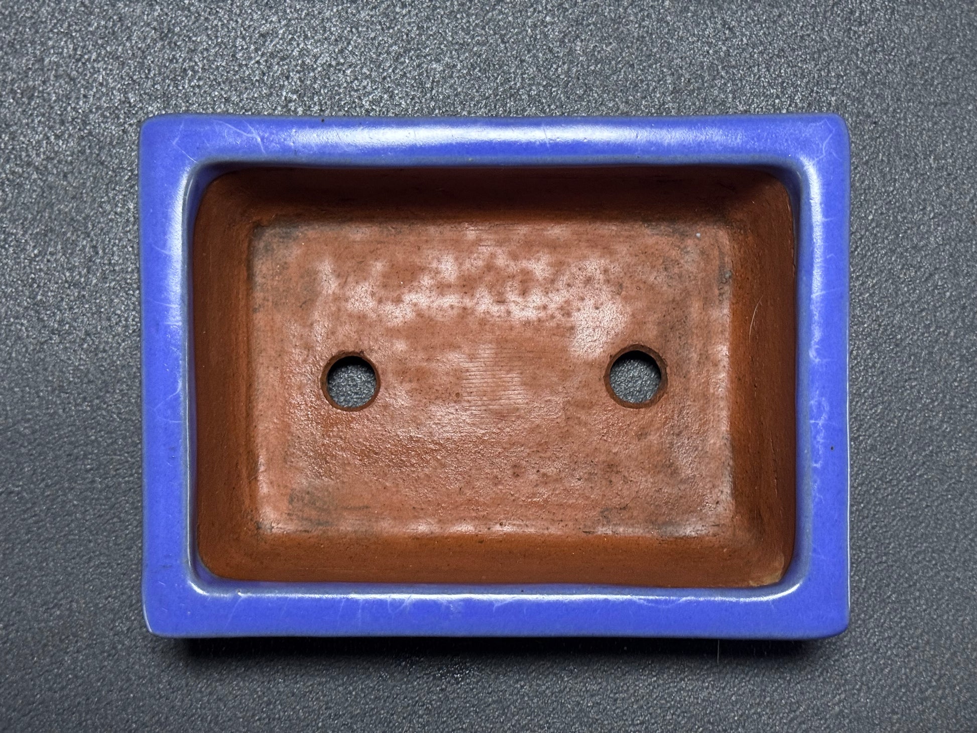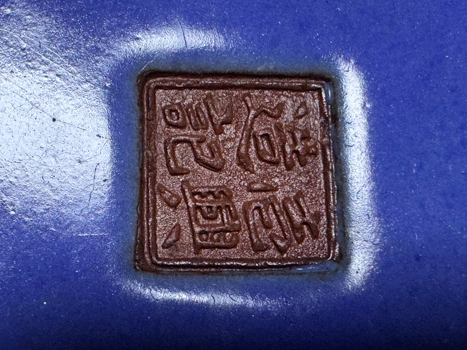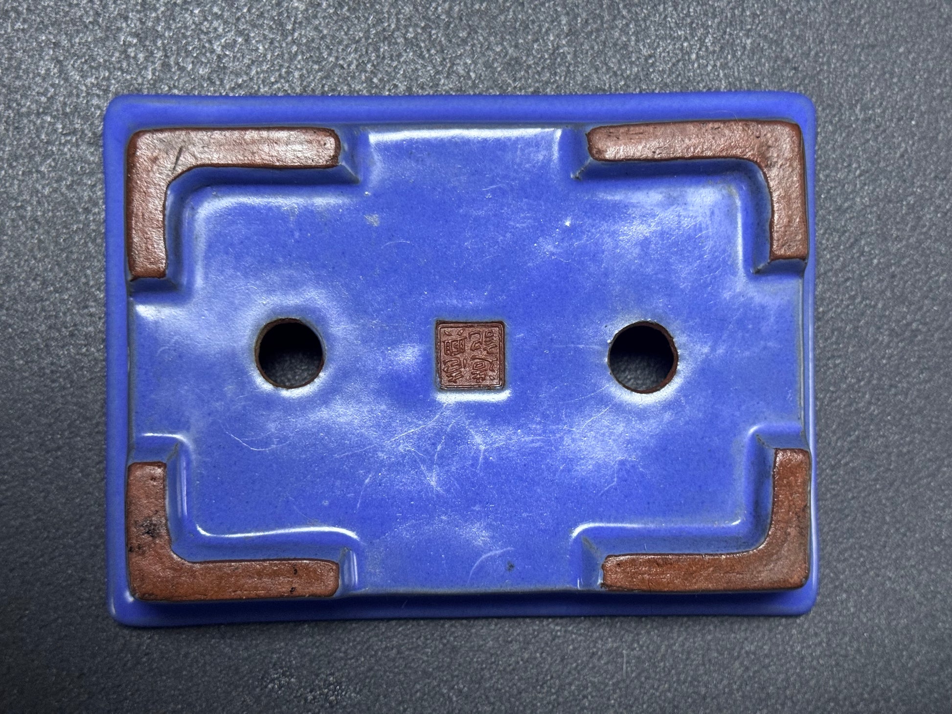 The underside is finished in the same blue glaze, a sign of thorough and complete craftsmanship. Two drainage holes are precisely cut and evenly spaced. At the centre is a sharply impressed square seal (落款 – rakkan), reading 壹興, identifying the piece as an authentic work by Watanabe Kazuhiro.