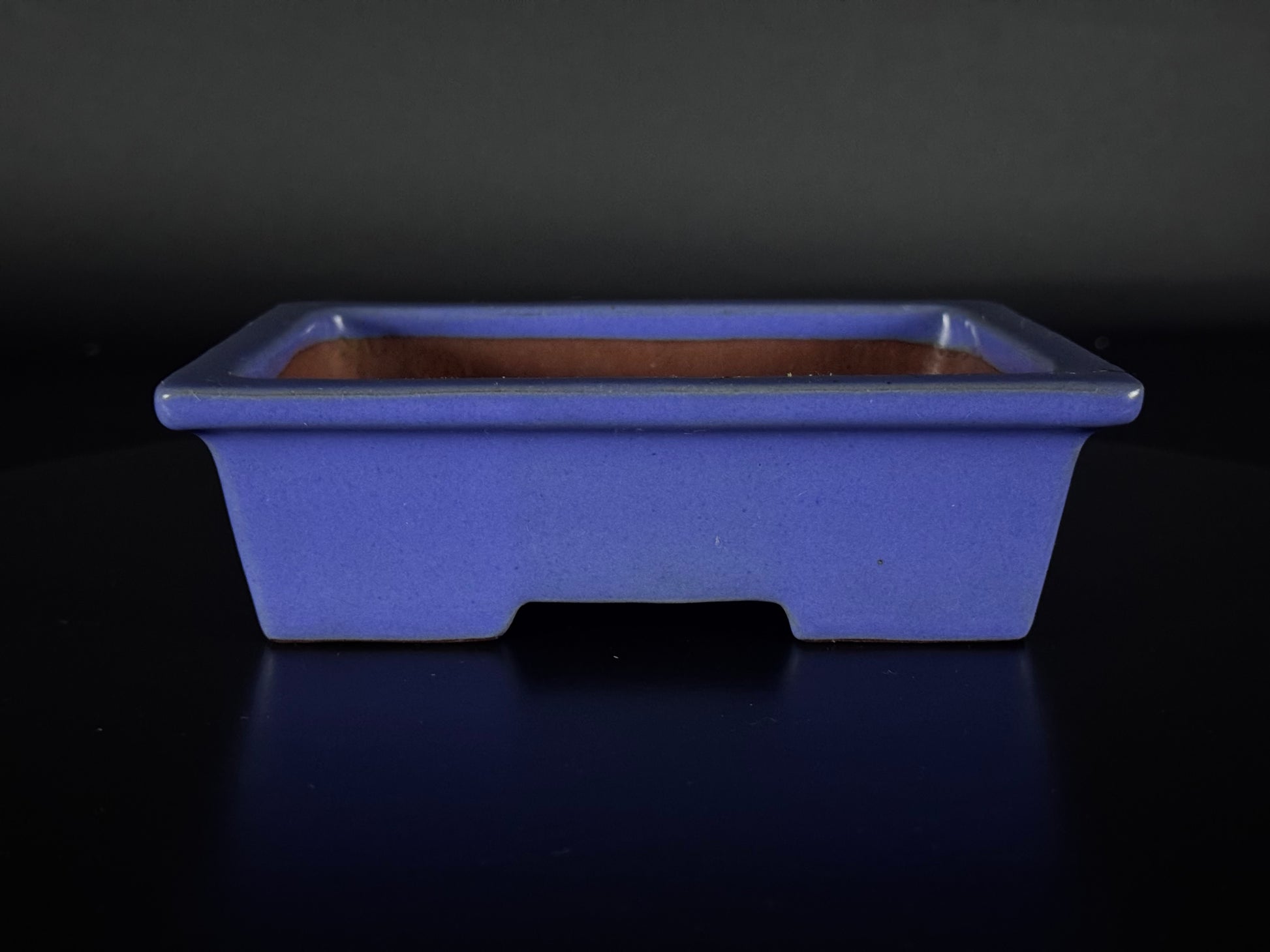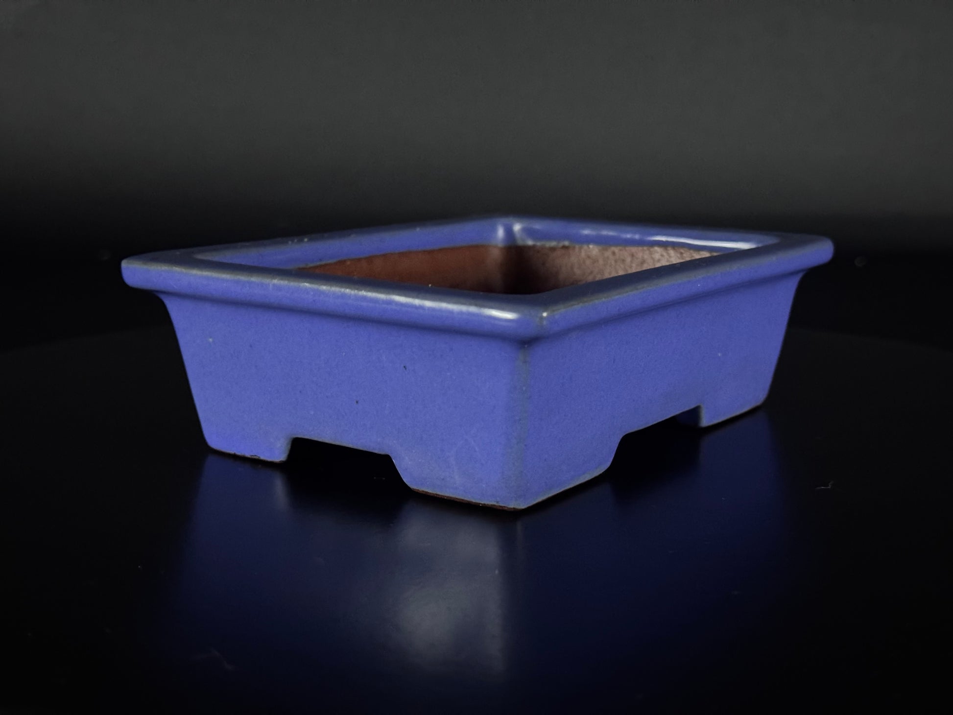 This striking rectangular bonsai pot is the work of Second-generation IKKO, Watanabe Kazuhiro (渡邉一弘), one of the most respected contemporary potters in Tokoname, Aichi Prefecture (常滑市). With a bold yet balanced aesthetic, this piece showcases IKKO’s deep understanding of form, function, and refined glazing. Finished in a rich indigo-toned blue glaze (藍釉 – aiyū), the surface carries a smooth, slightly lustrous quality. There is a subtle layering of colour visible in areas of reflected light, giving the pot depth and quiet vibrancy. The glaze thins naturally at the sharp upper rim and base edges, revealing touches of the underlying warm Tokoname clay—a small but important aesthetic element characteristic of high-quality kiln work.