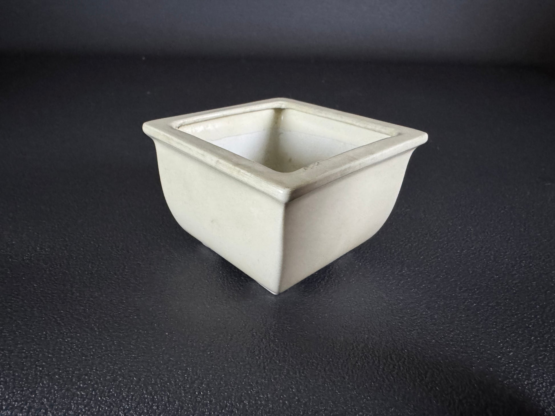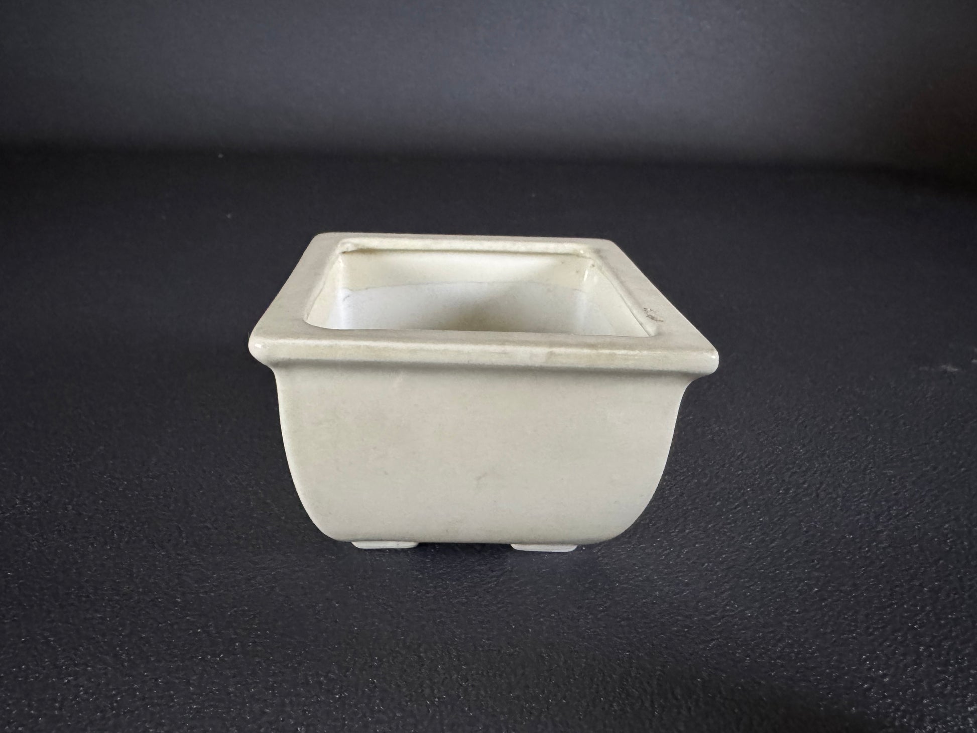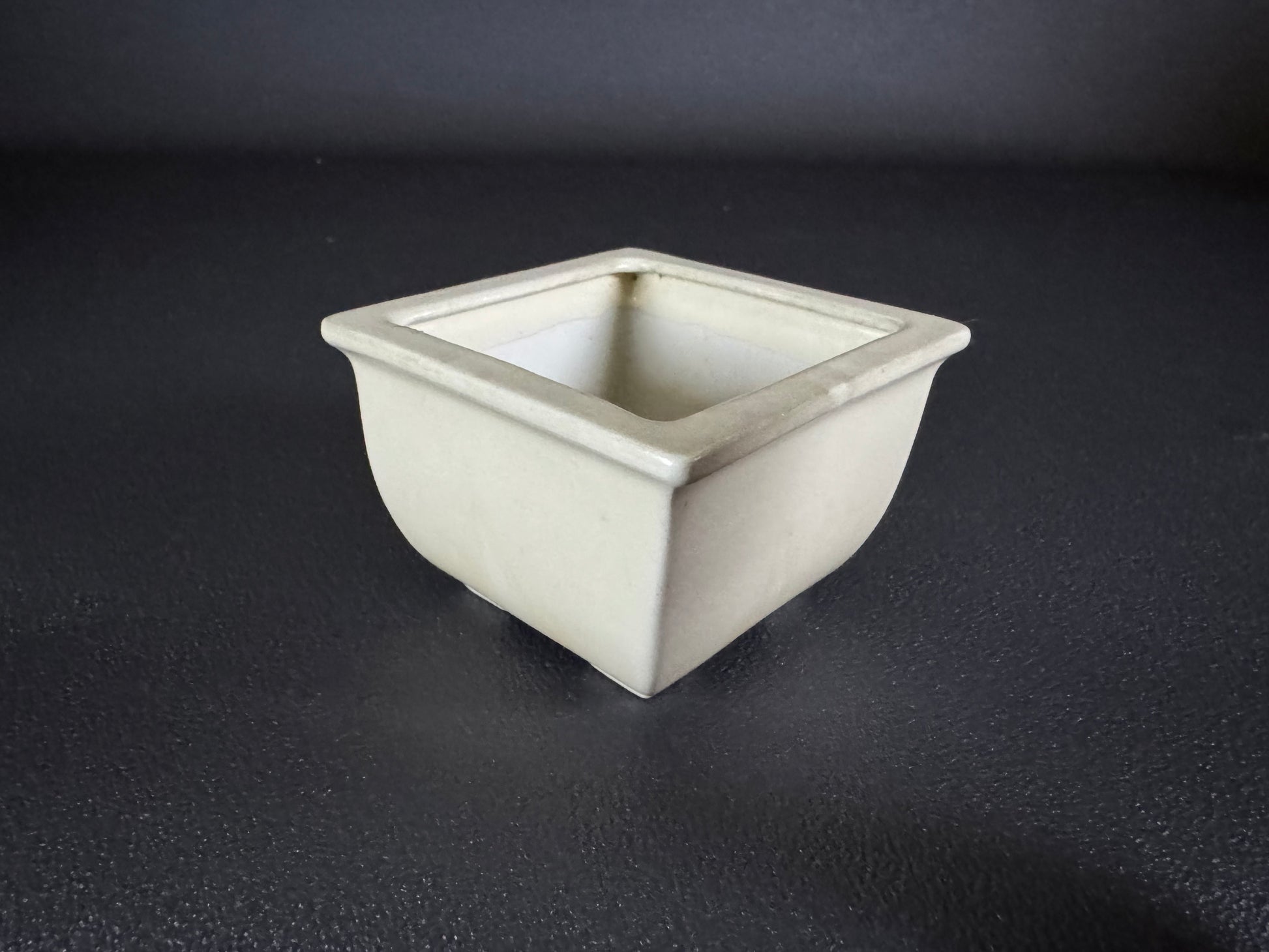 This small square bonsai pot, measuring 8cm in width and 5.5cm in height, is the work of First-Generation Ishida Shoseki, a distinguished Japanese potter renowned for his finely crafted porcelain vessels. Formed with precise geometry, the walls rise with a gentle outward flare from a slightly recessed base, supported by four integral corner feet that impart a sense of lightness and elevation.
