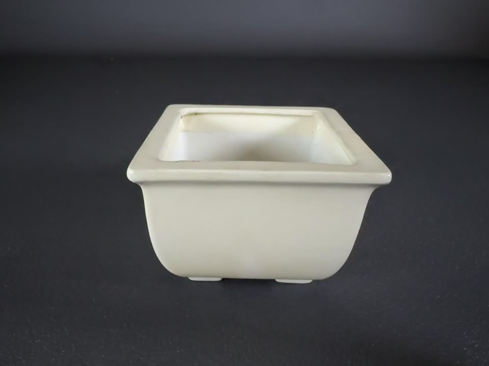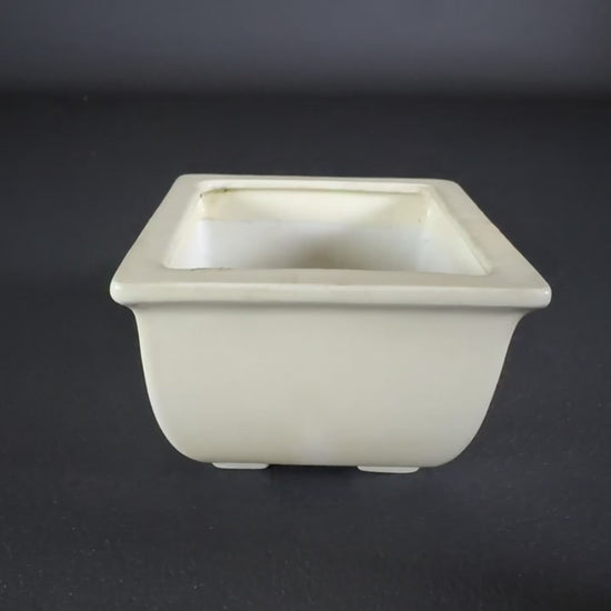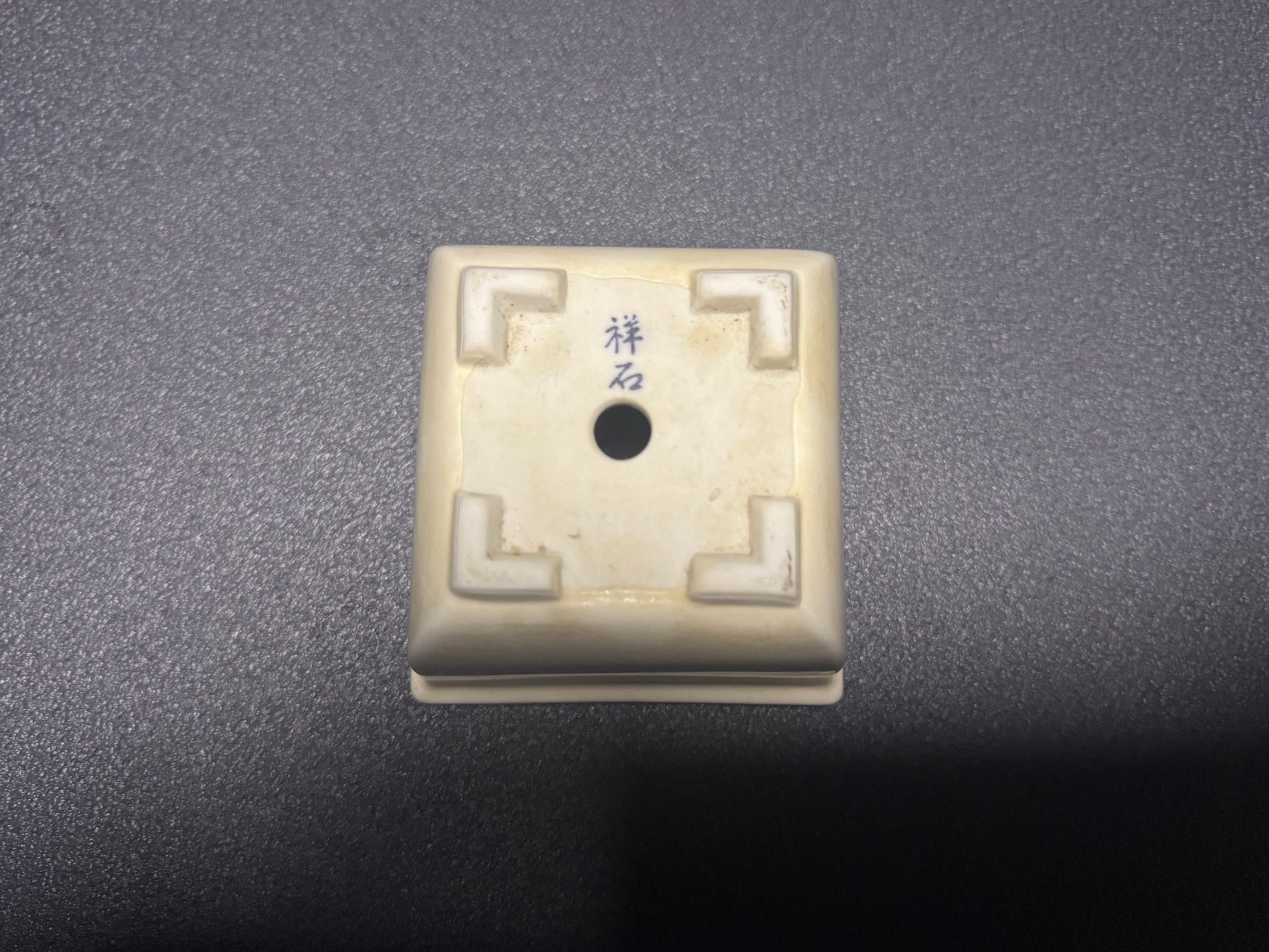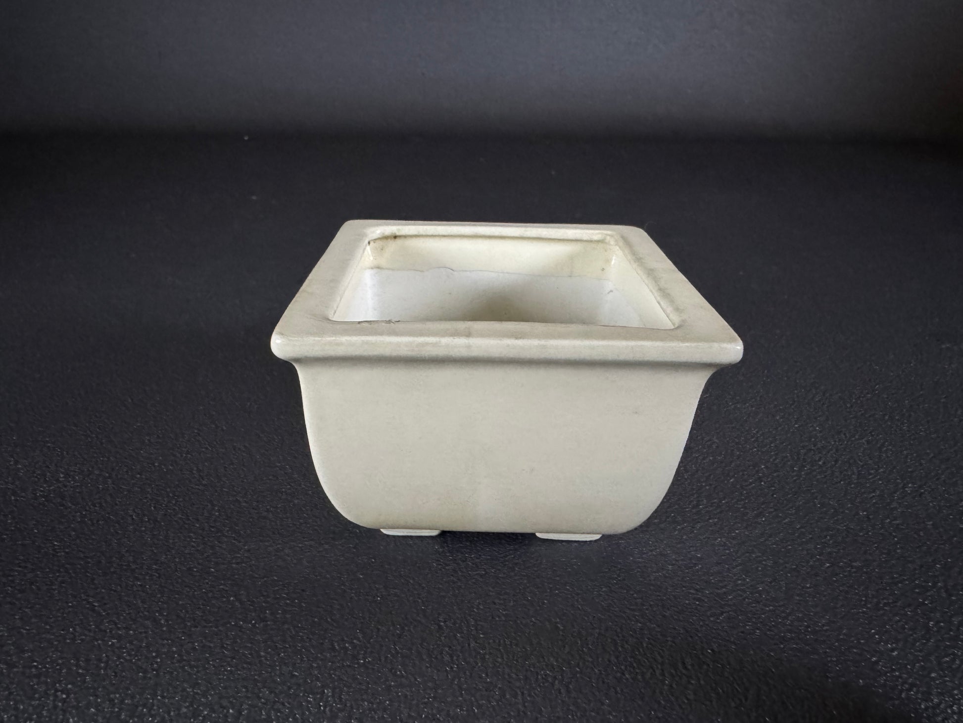 This small square bonsai pot, measuring 8cm in width and 5.5cm in height, is the work of First-Generation Ishida Shoseki, a distinguished Japanese potter renowned for his finely crafted porcelain vessels. Formed with precise geometry, the walls rise with a gentle outward flare from a slightly recessed base, supported by four integral corner feet that impart a sense of lightness and elevation.
