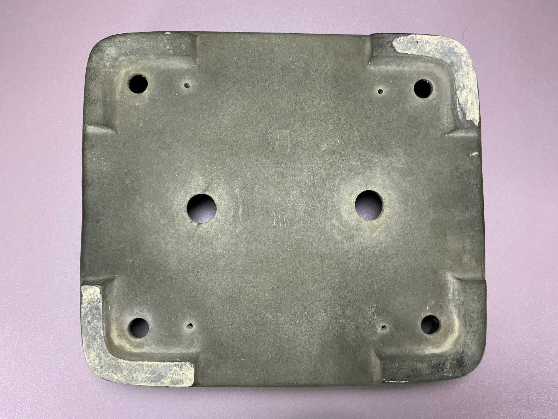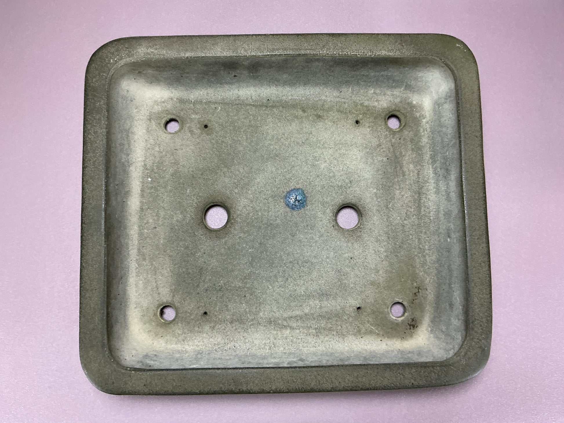 A medium/large unglazed rectangle, straight sides, slight internal rim, cut feet, slip spray finish (granite/olive green?). This pot features a spray slip finish, imparting a very subtle textured feel.