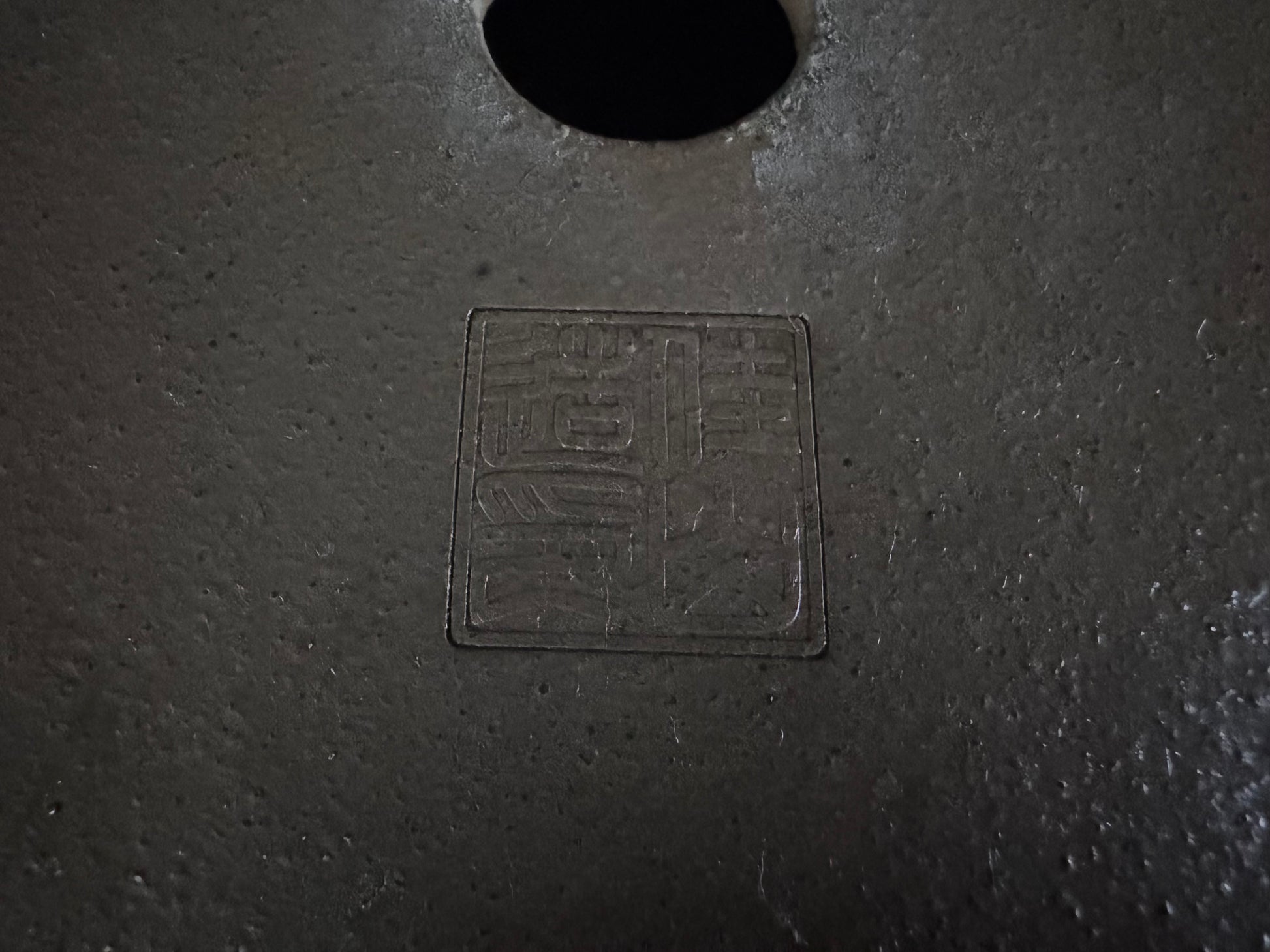 On the underside, Keizan’s impressed seal (桂山印) is clearly visible beside a well-structured drainage layout—one large central hole with four smaller wiring holes (排水穴・針金穴)—a hallmark of traditional Tokoname craftsmanship (常滑焼の伝統的な作り).