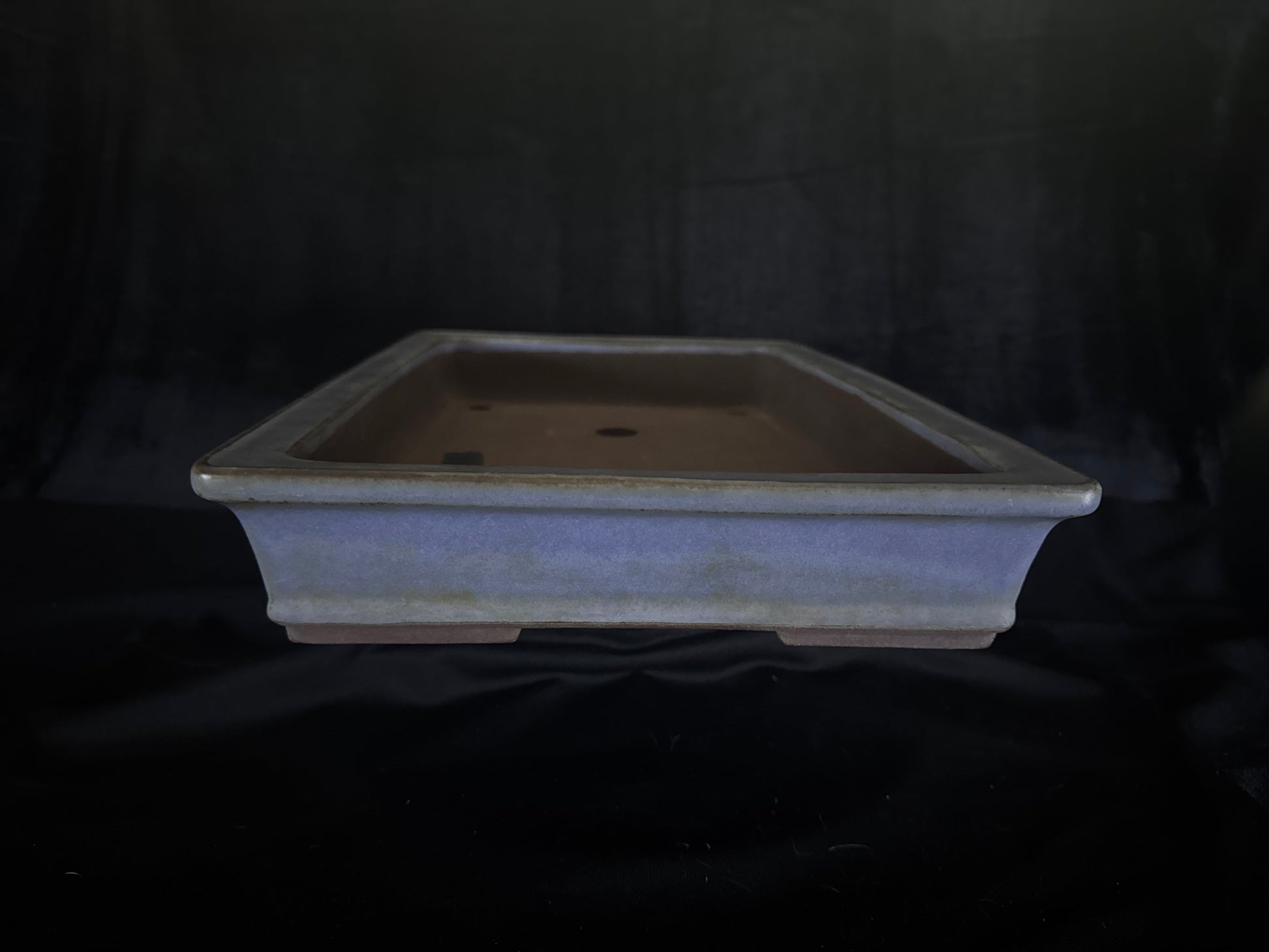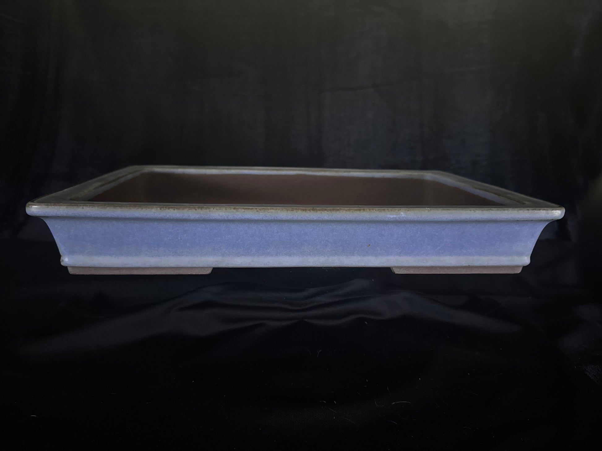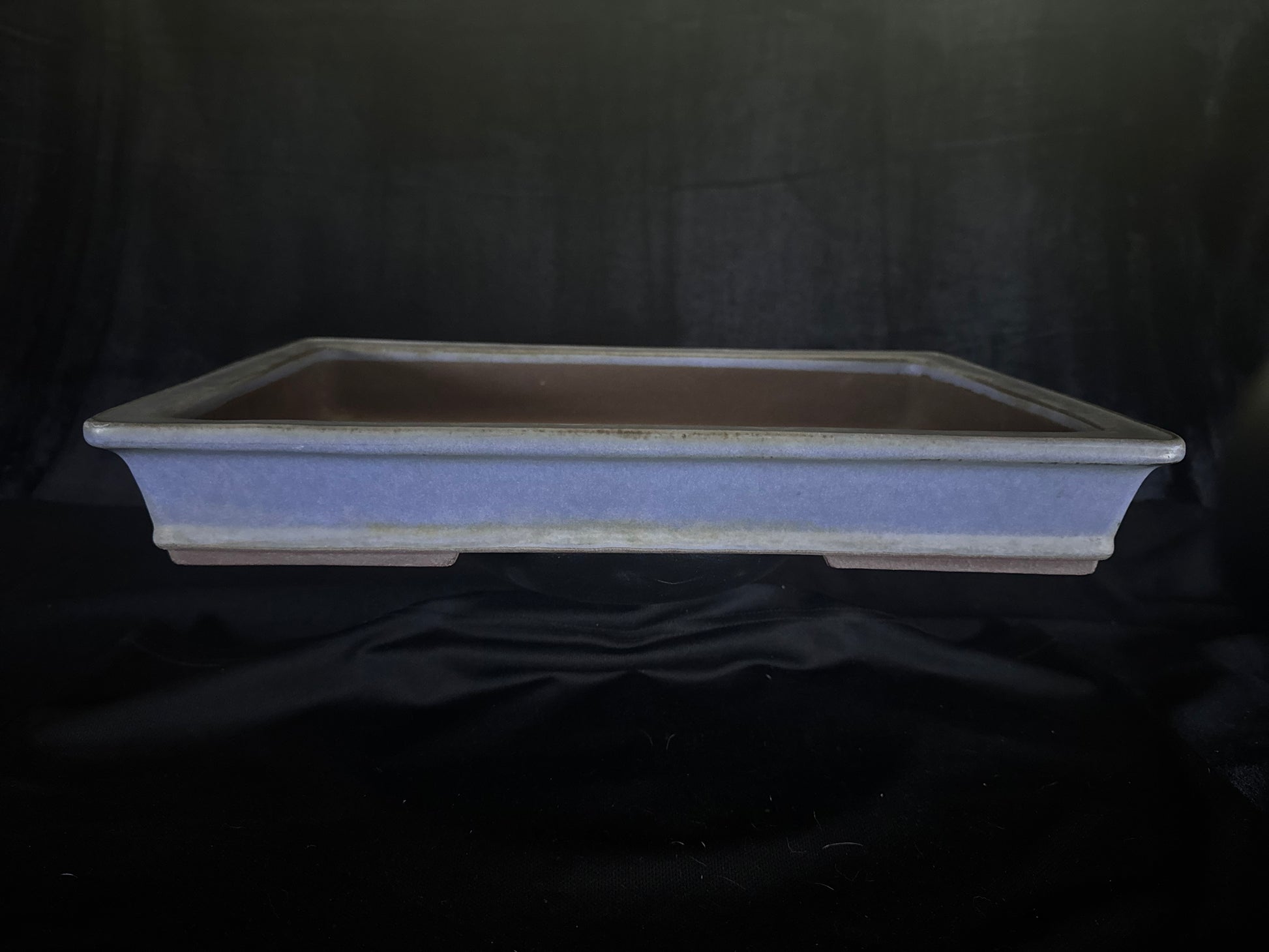 This elegant, handmade pot has a traditional rectangular form and is ideal for many deciduous and flowering trees. The pot features recessed feet and is finished in a light blue Kino glaze—a classic glaze that has proven popular for decades, as it pairs well with many leaf colours. And bears his signature beside the Yamaaki seal.