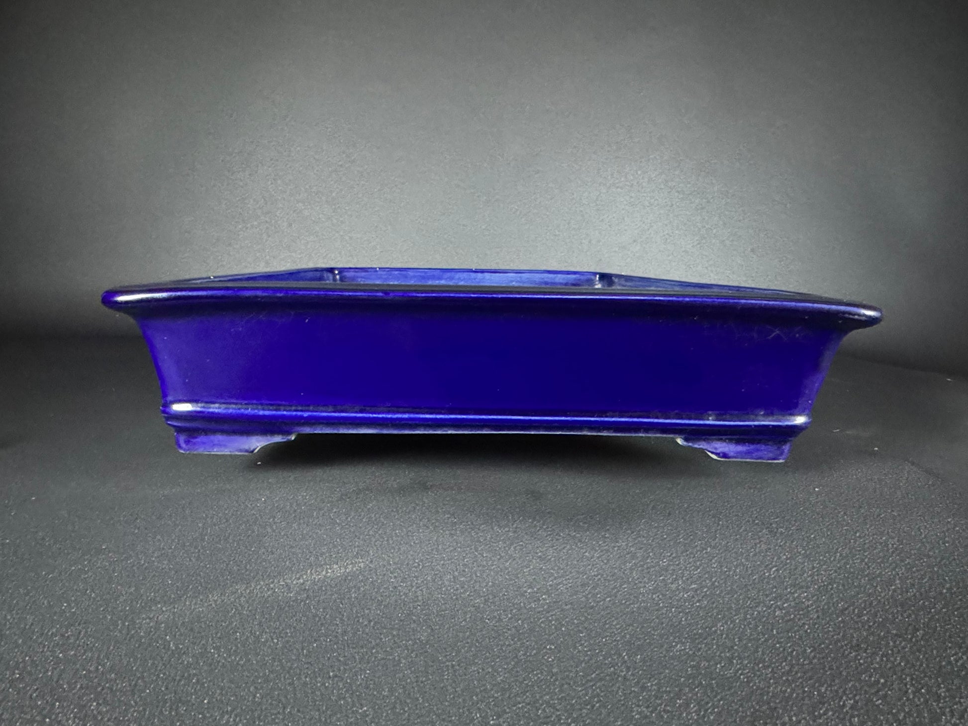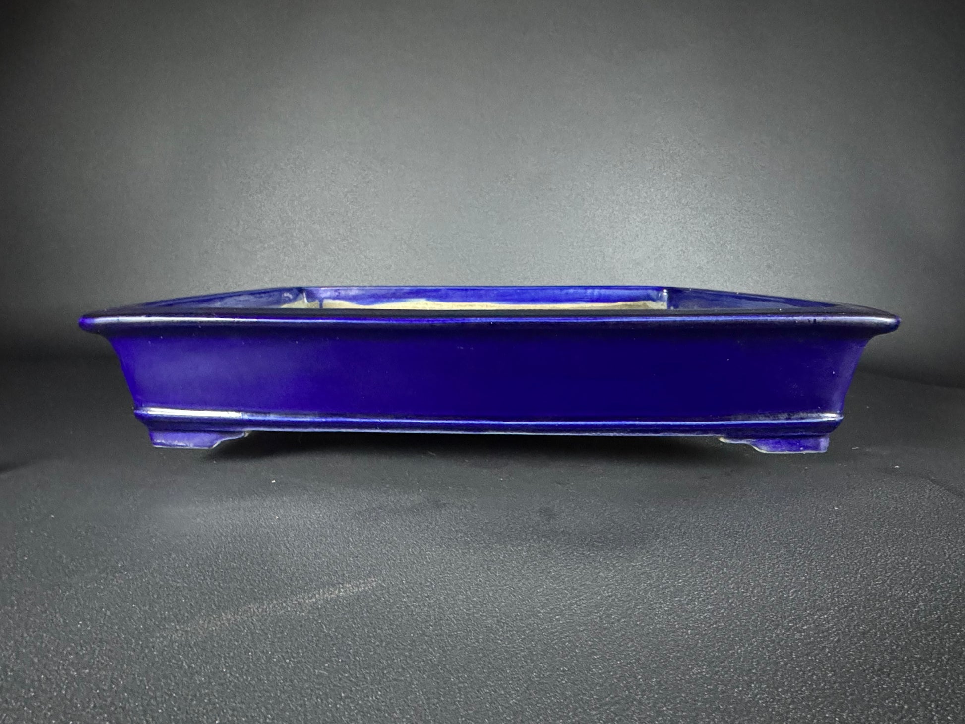A large, rectangular (chōhō-gata) featuring a gently flared walls and a wide, bevelled lip (fukuro-mimi style), basal band, refined corner stepped feet with subtle inward tuck, lending visual lightness despite the generous proportions. The glaze in a Lustrous 瑠璃色 (Ruri-iro) — a deep cobalt blue glaze, evenly applied with remarkable clarity and depth. The surface captures light to reveal subtle tonal shifts, enhancing the contrast with planted compositions.