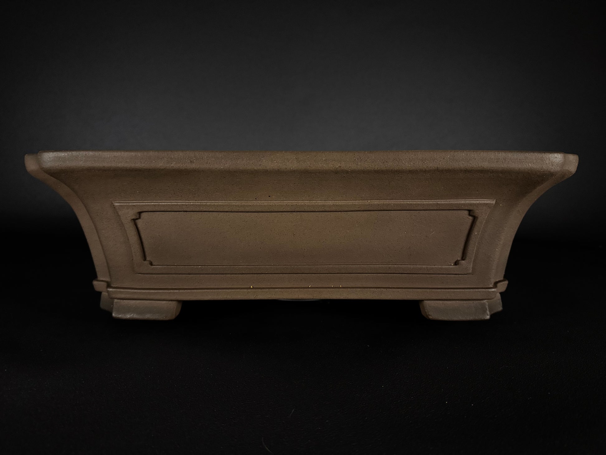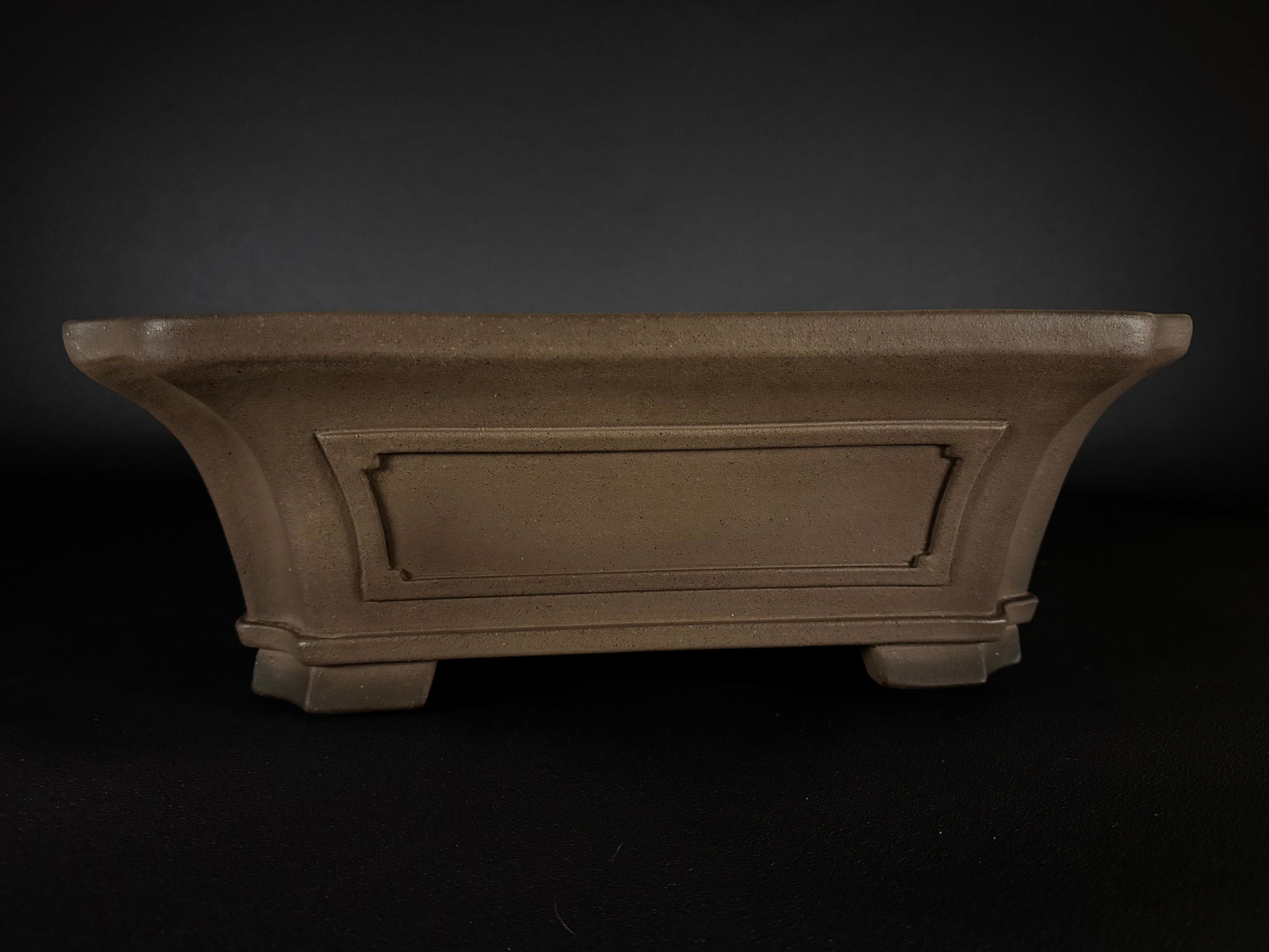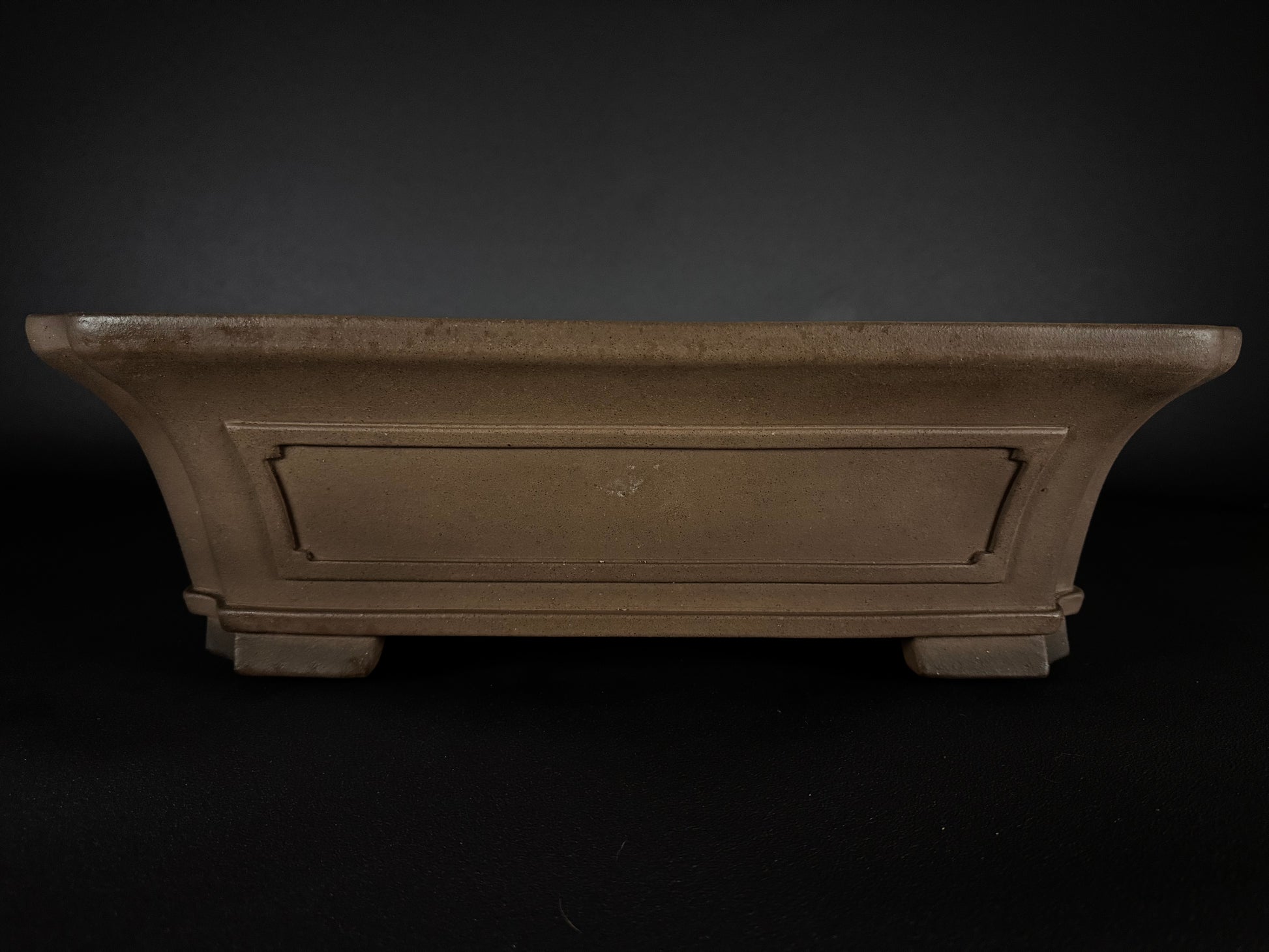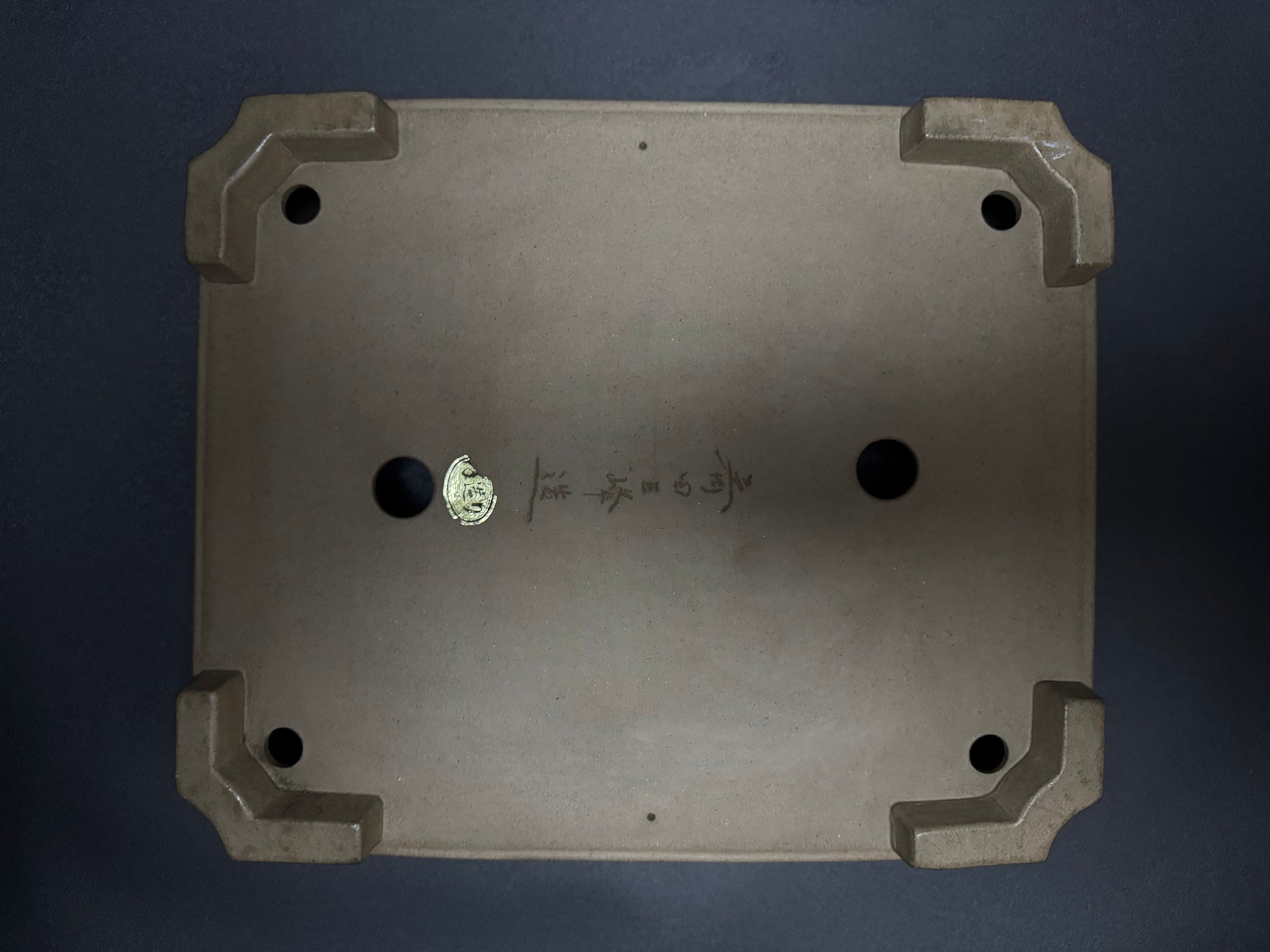 本作品は、日本の陶芸家 三方(さんぽう / Sanpou、本名:斉田三蔵) によって手作業で製作された、無釉の長方形盆栽鉢です。昭和中期の日本盆栽陶芸の伝統を体現する、構造美と静かな品格を備えた逸品です。