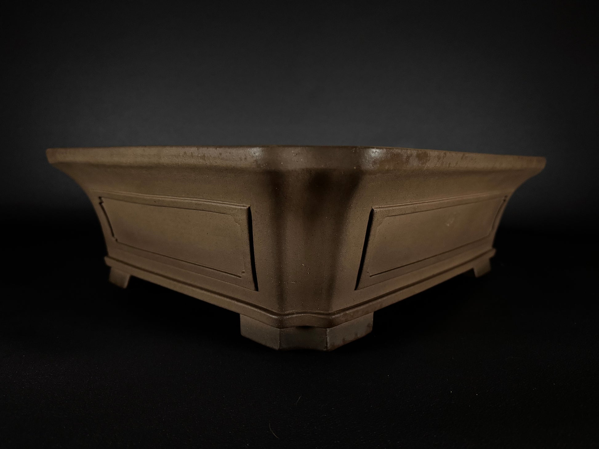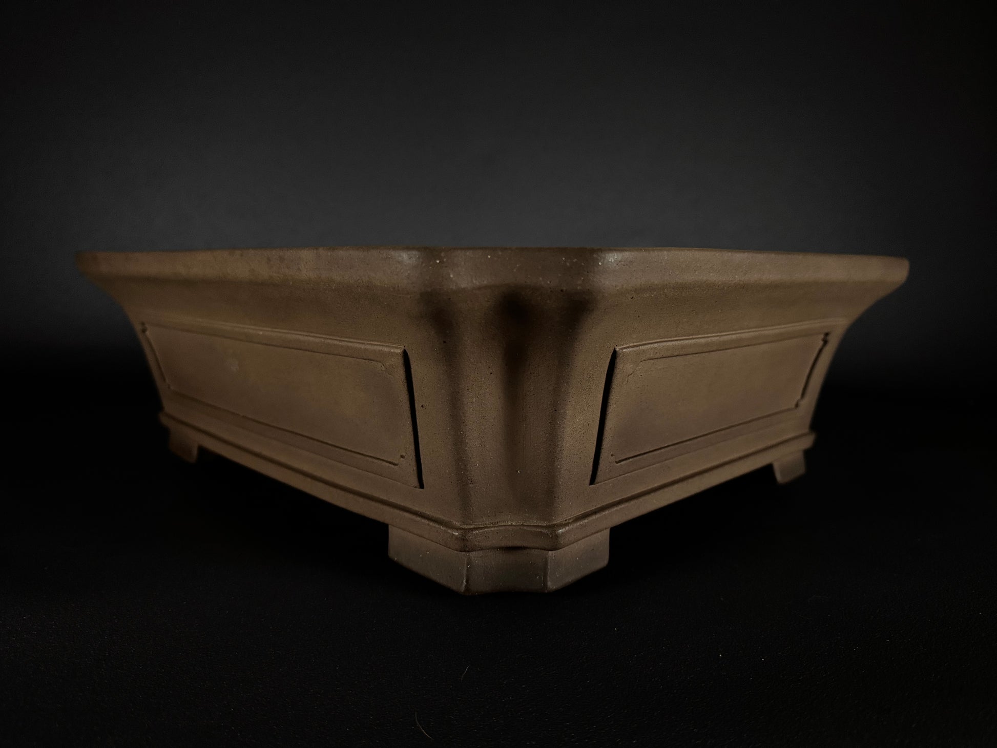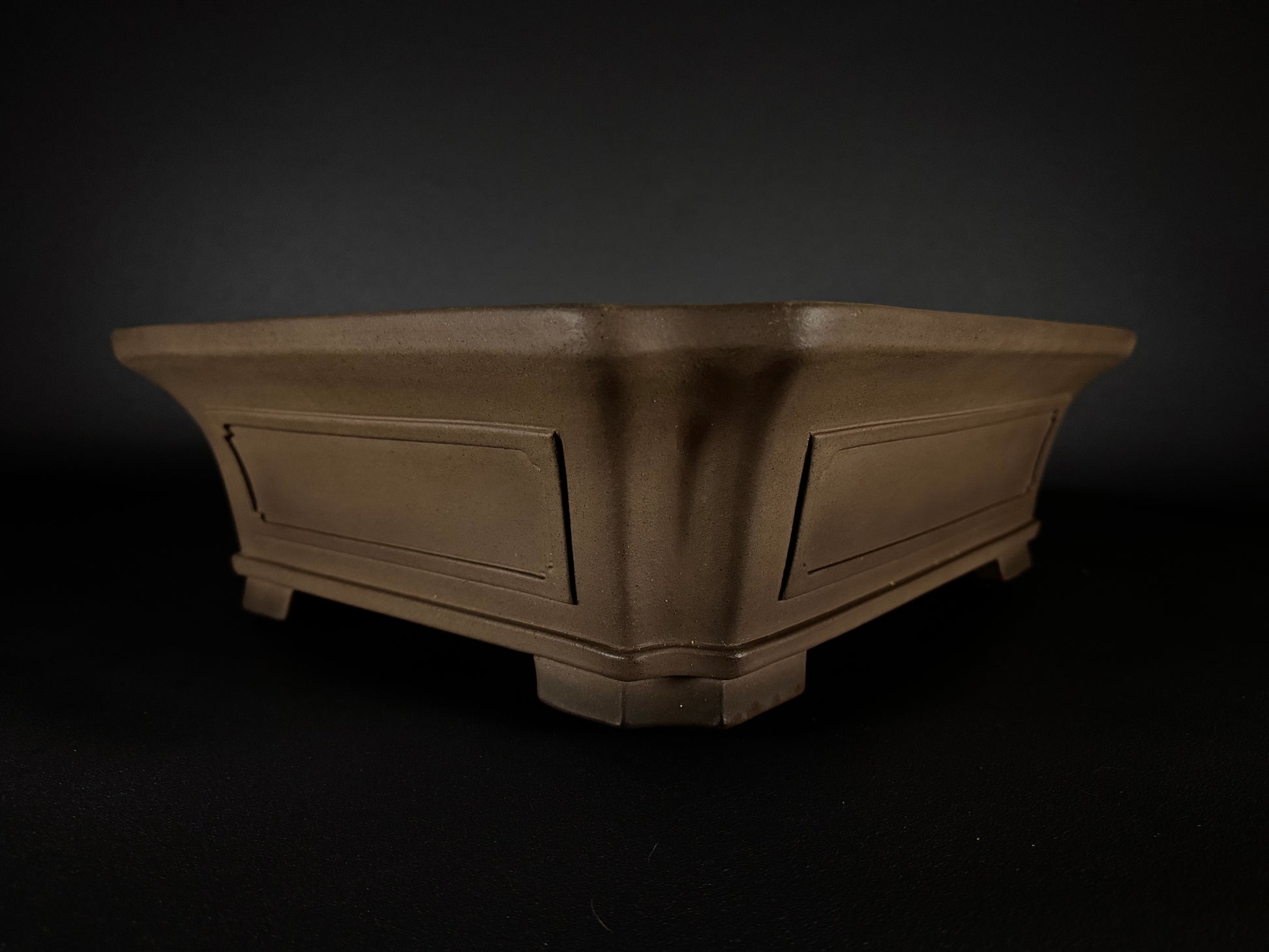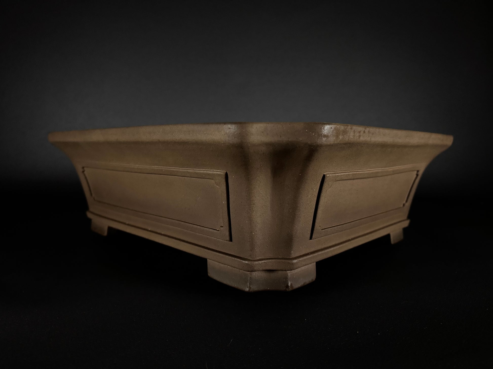 本作品は、日本の陶芸家 三方(さんぽう / Sanpou、本名:斉田三蔵) によって手作業で製作された、無釉の長方形盆栽鉢です。昭和中期の日本盆栽陶芸の伝統を体現する、構造美と静かな品格を備えた逸品です。