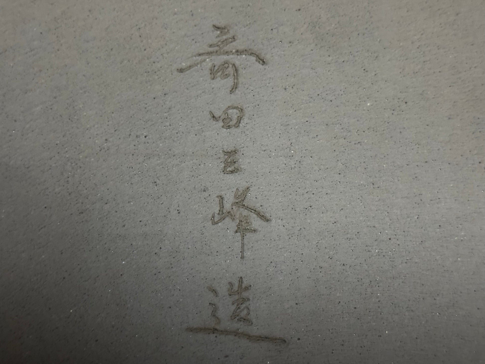 鉢裏には、作家本人による**銘(めい)が彫られており、金色のラベルも残存しており、本作が正真正銘の三方作(斉田三蔵 作)**であることを証明しています。