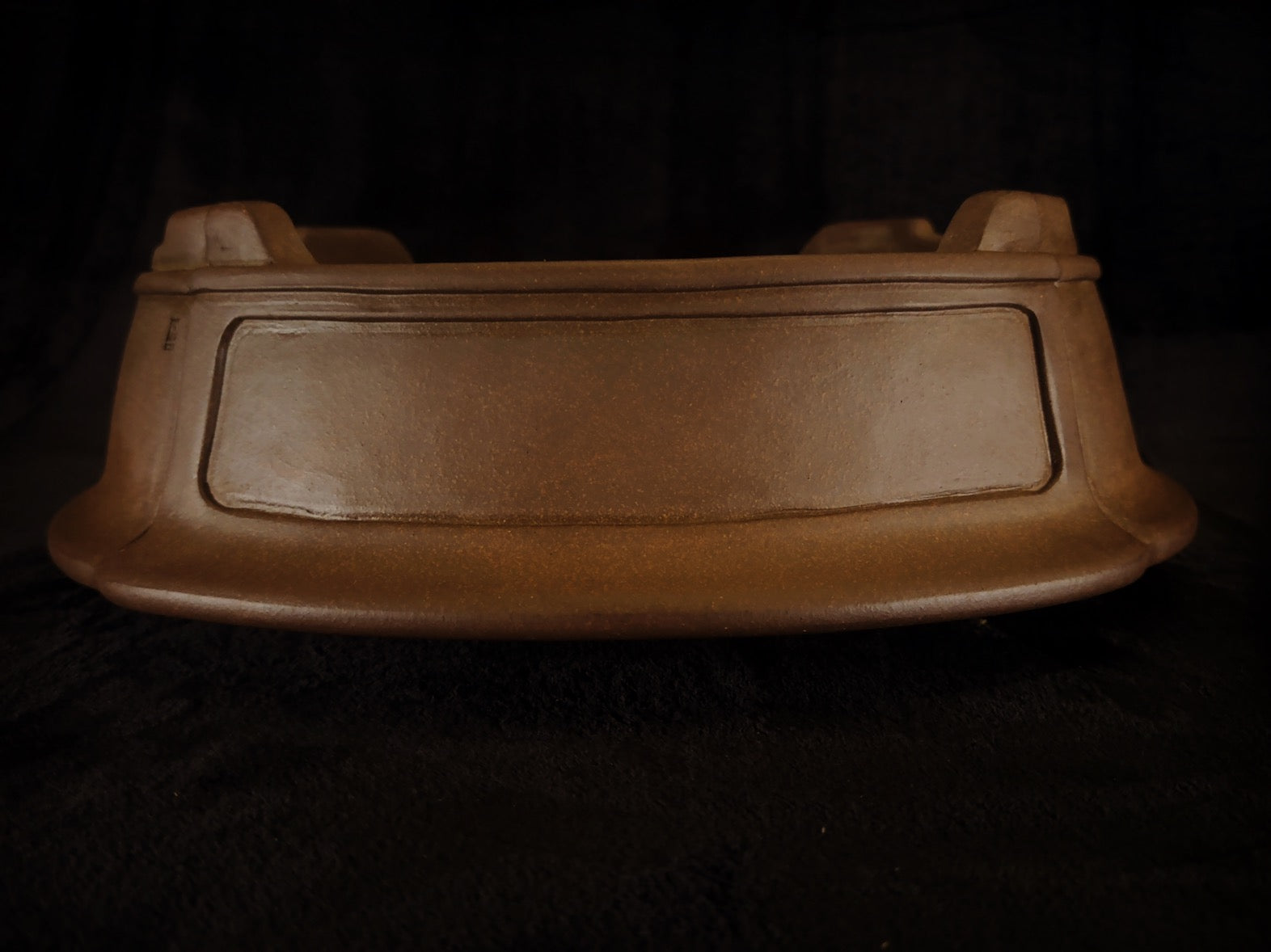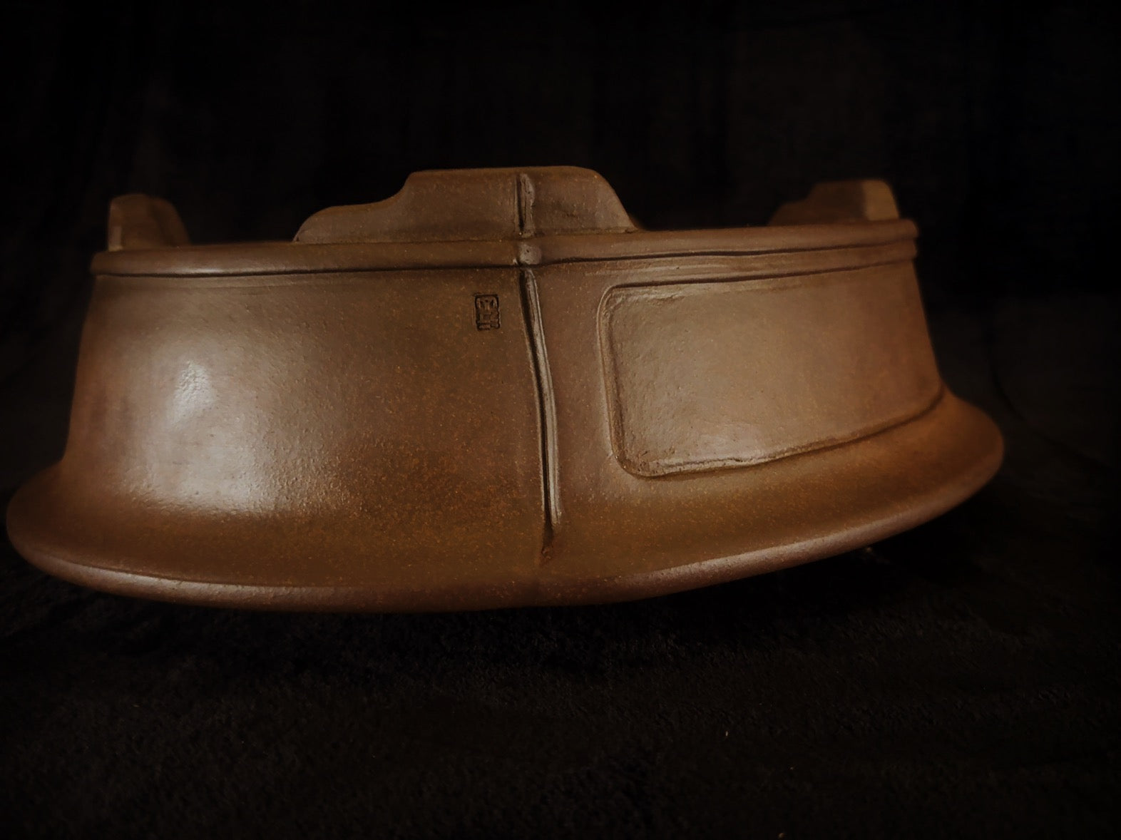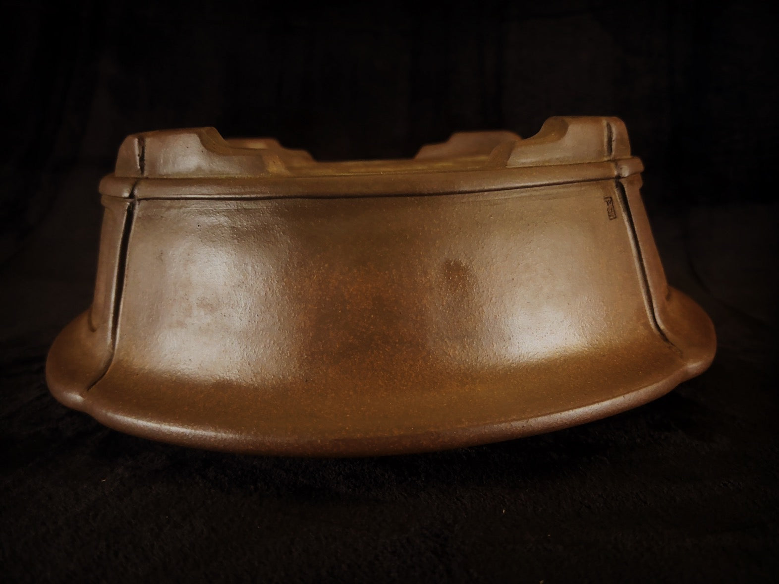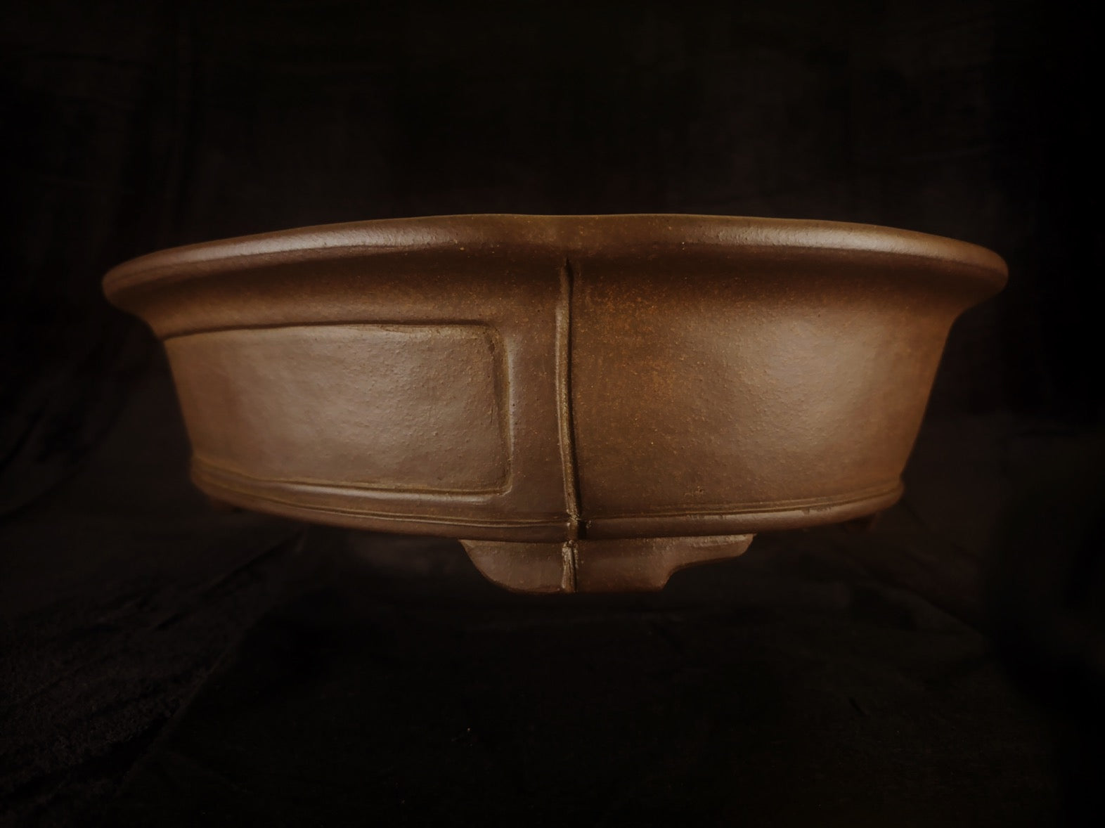 This large, Mokko oval-quince-style, unglazed, rare, hand-custom-made piece features a raised lip & basal banding detail, stepped feet, and recessed panels on the front and back. It is made from one of Nakanos' special mixed formulas of clays; The lip is also finished with a refined raised border, complementing the overall 'shibui' design.