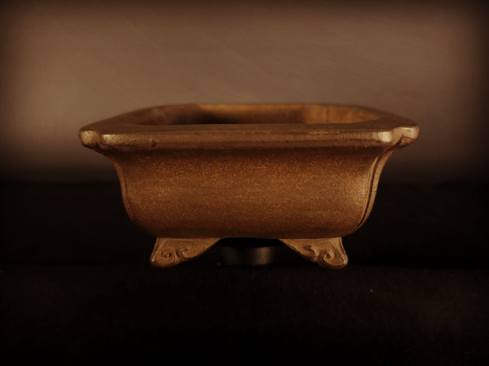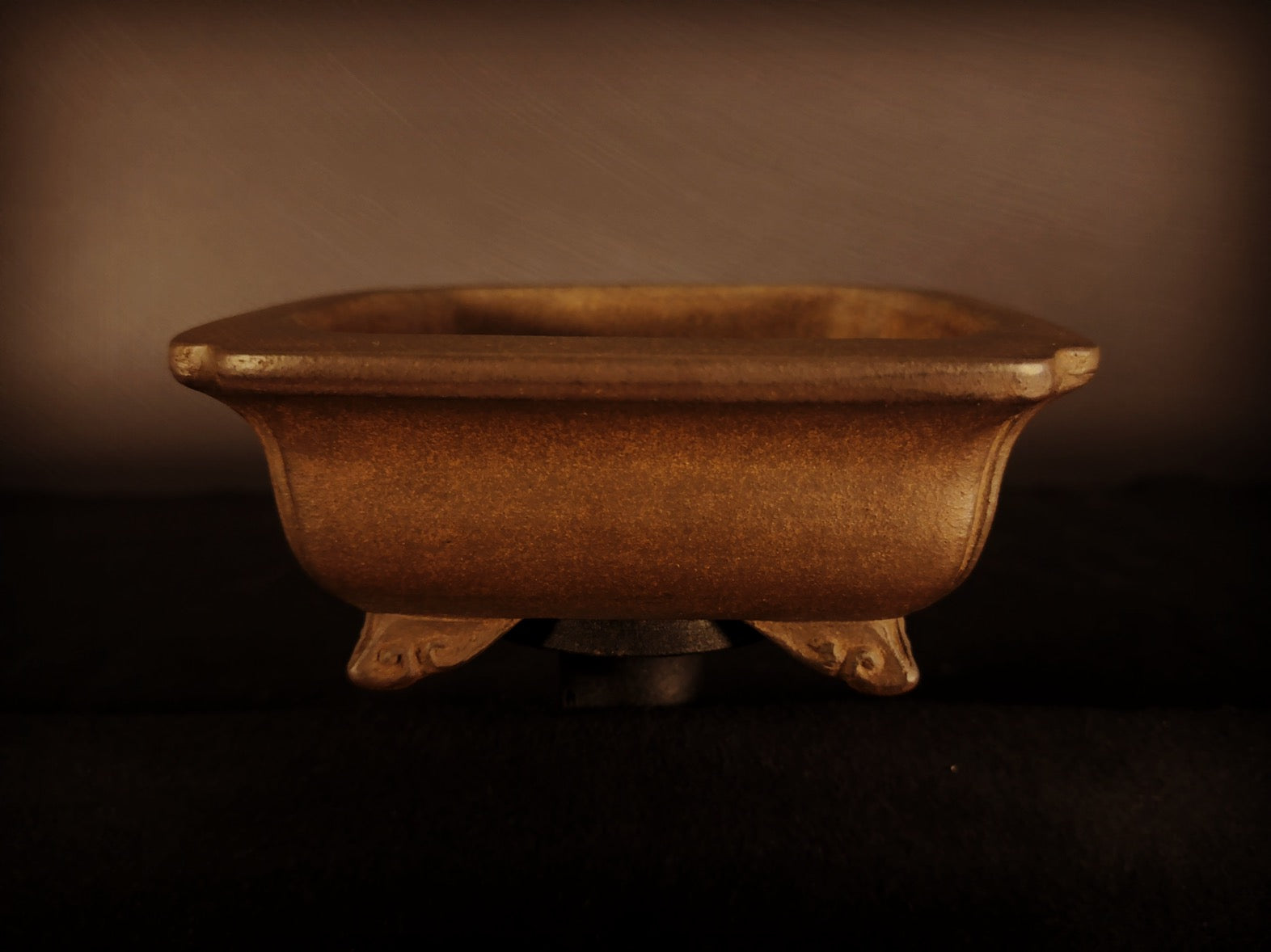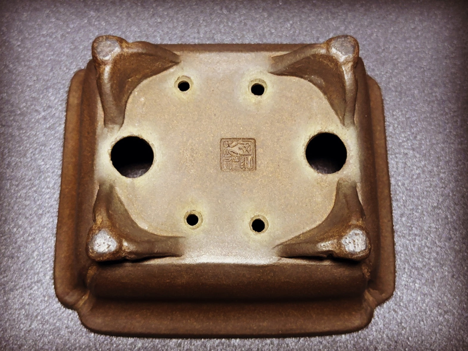 The cloud-shaped feet (雲脚 - unkyaku) are a key feature of this pot, slightly lifting it off the surface. These feet, with their subtle outward angles, provide both functional stability and graceful elevation. The four drainage holes (排水穴 - haisui ana) ensure optimal bonsai health, allowing for proper water flow and drainage.