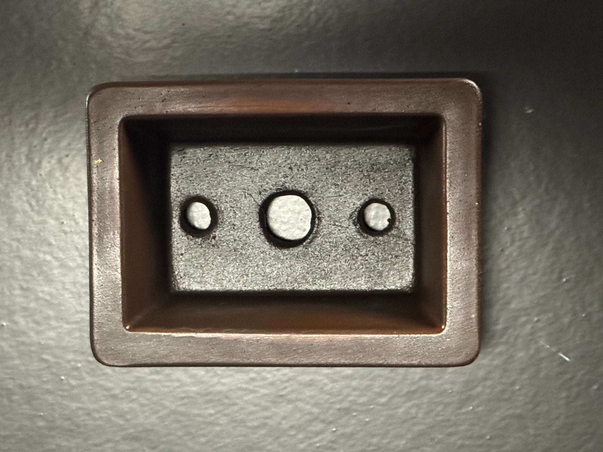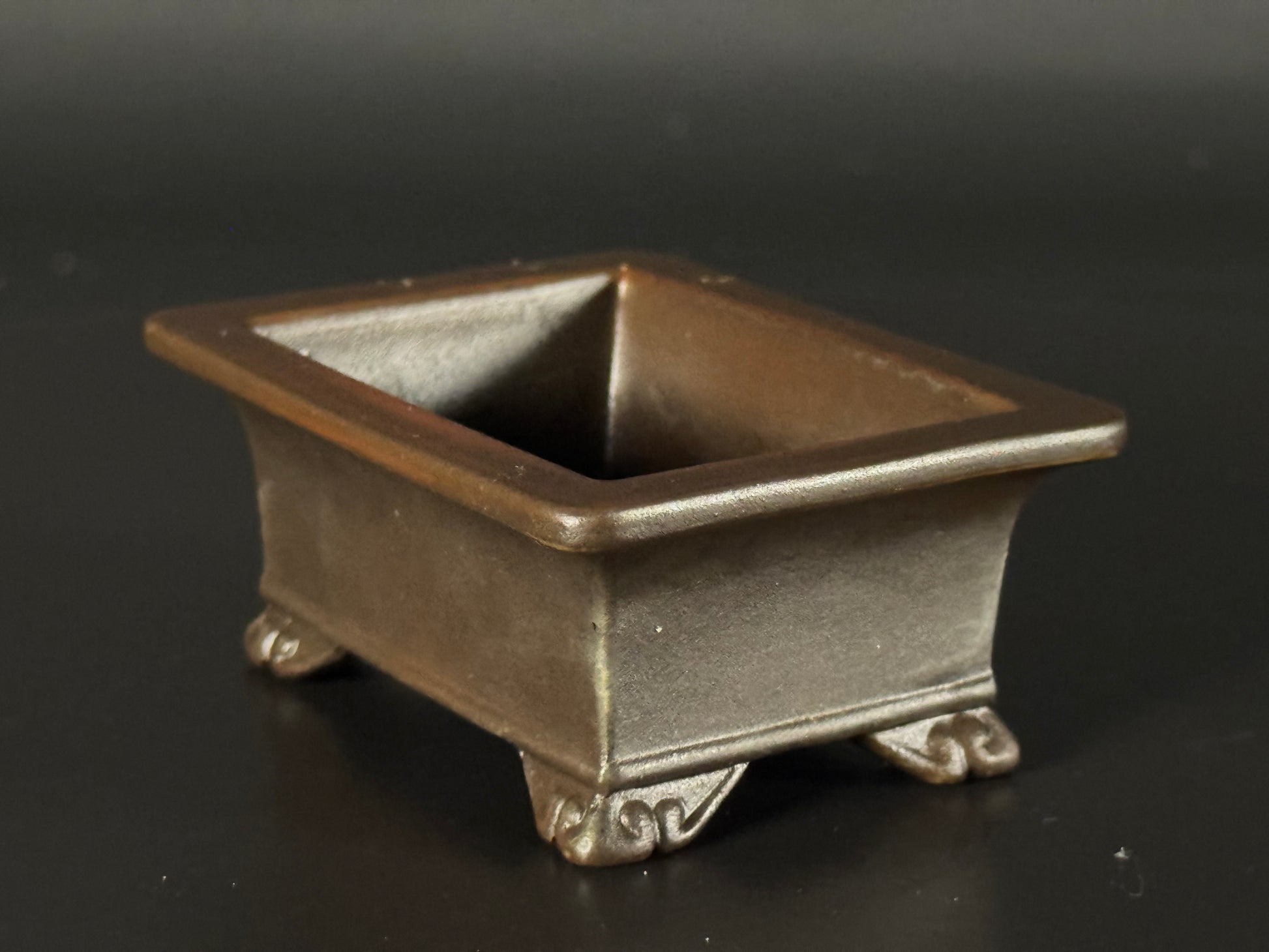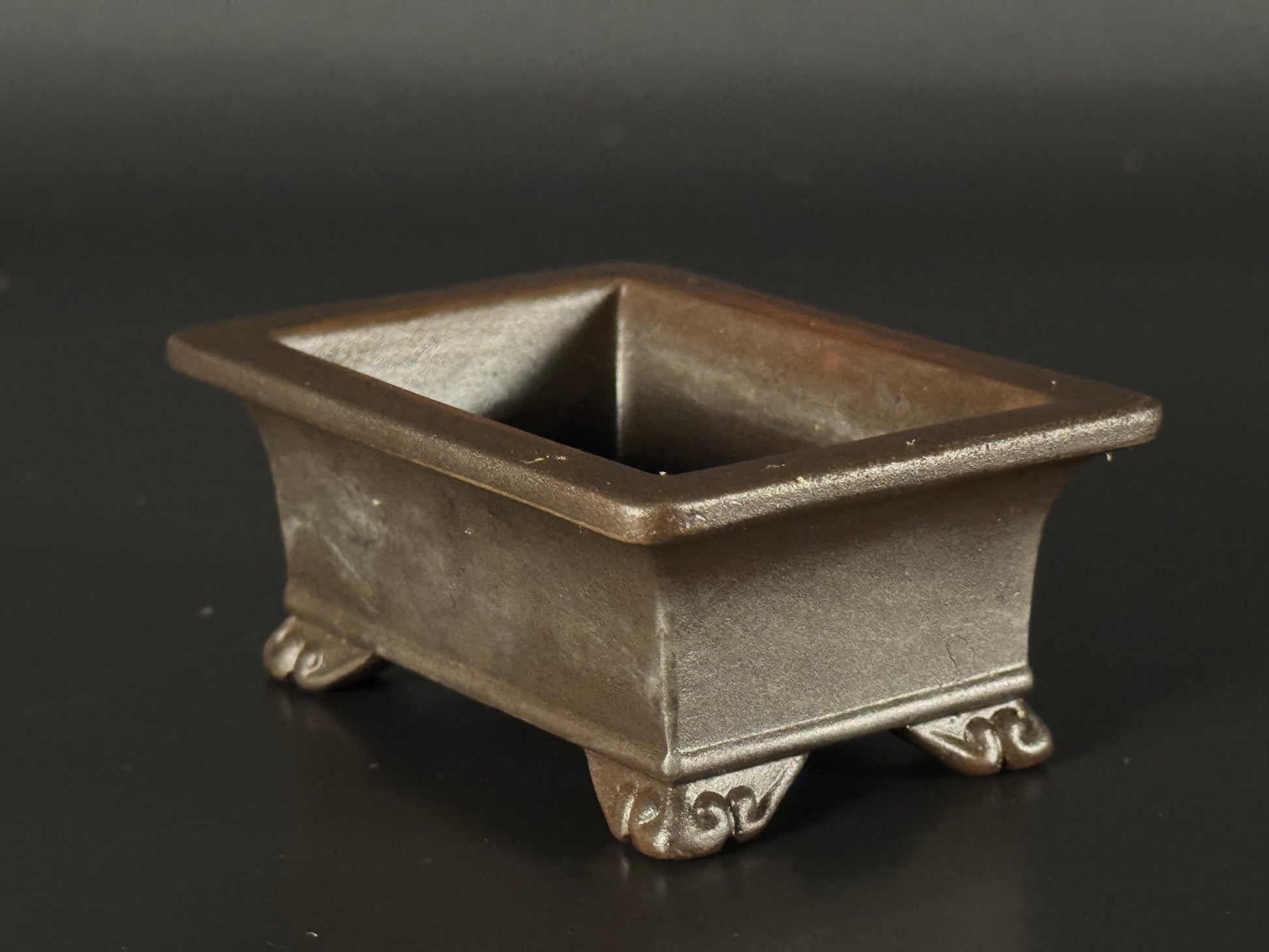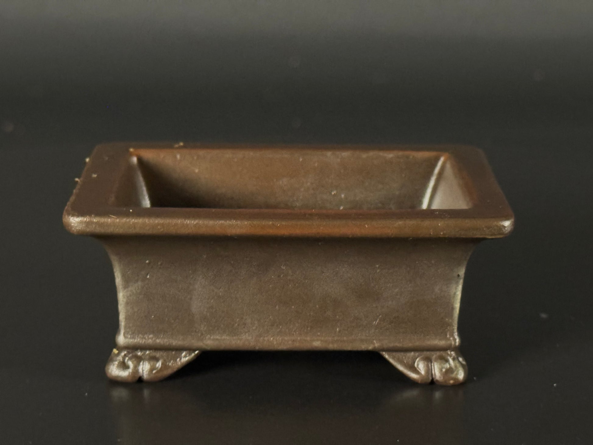 An amazing Mame-sized, unglazed rectangle features a very smooth raised lip that is finished, cloud feet slightly angled outwards and banding on the base, a style often associated with formality and strength, giving it lift and visual presence. The clay is the distinctive purple brown of the Tokoname area,