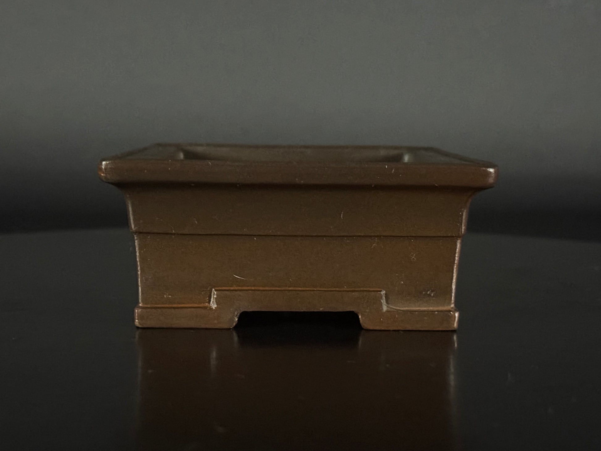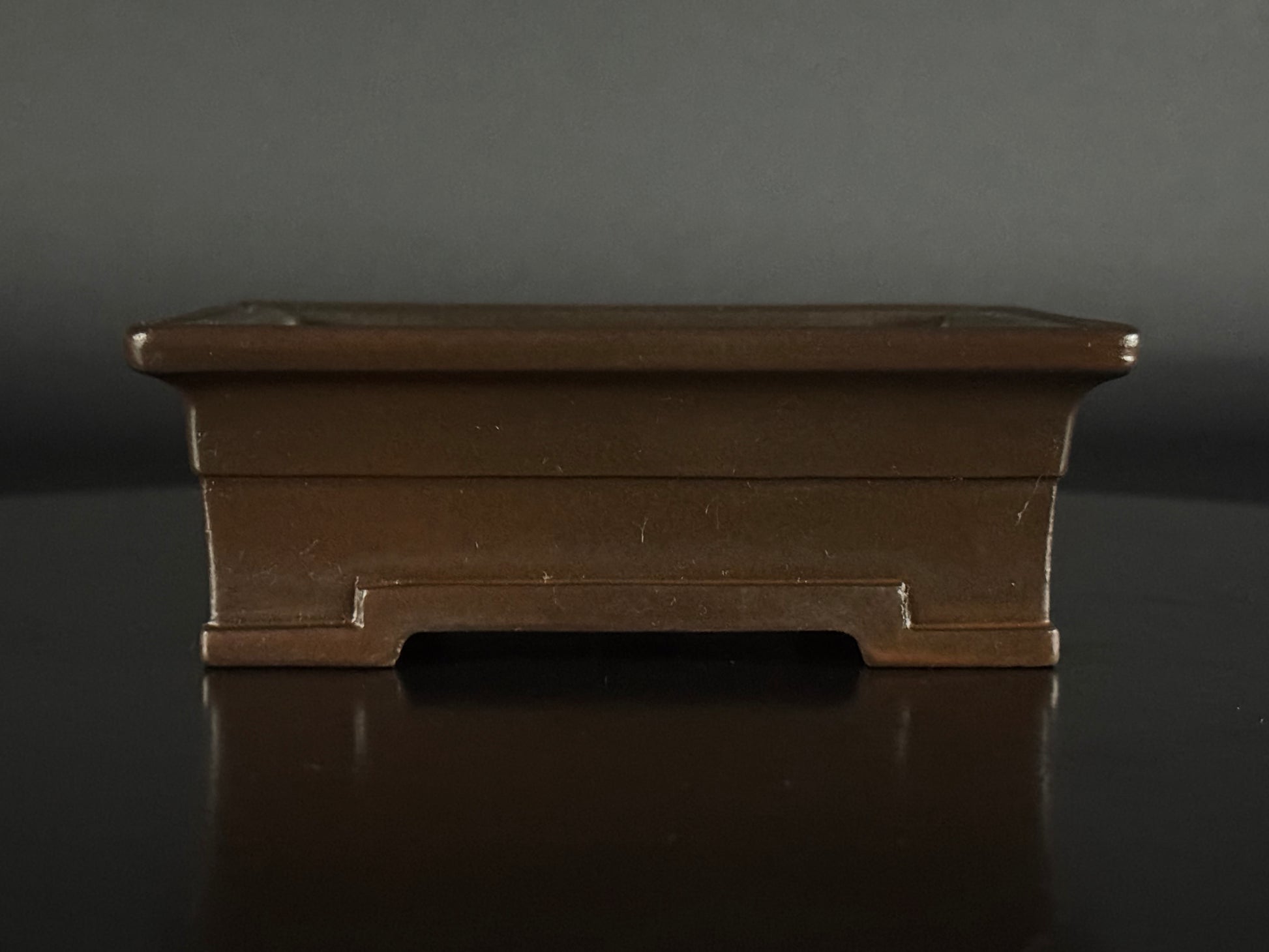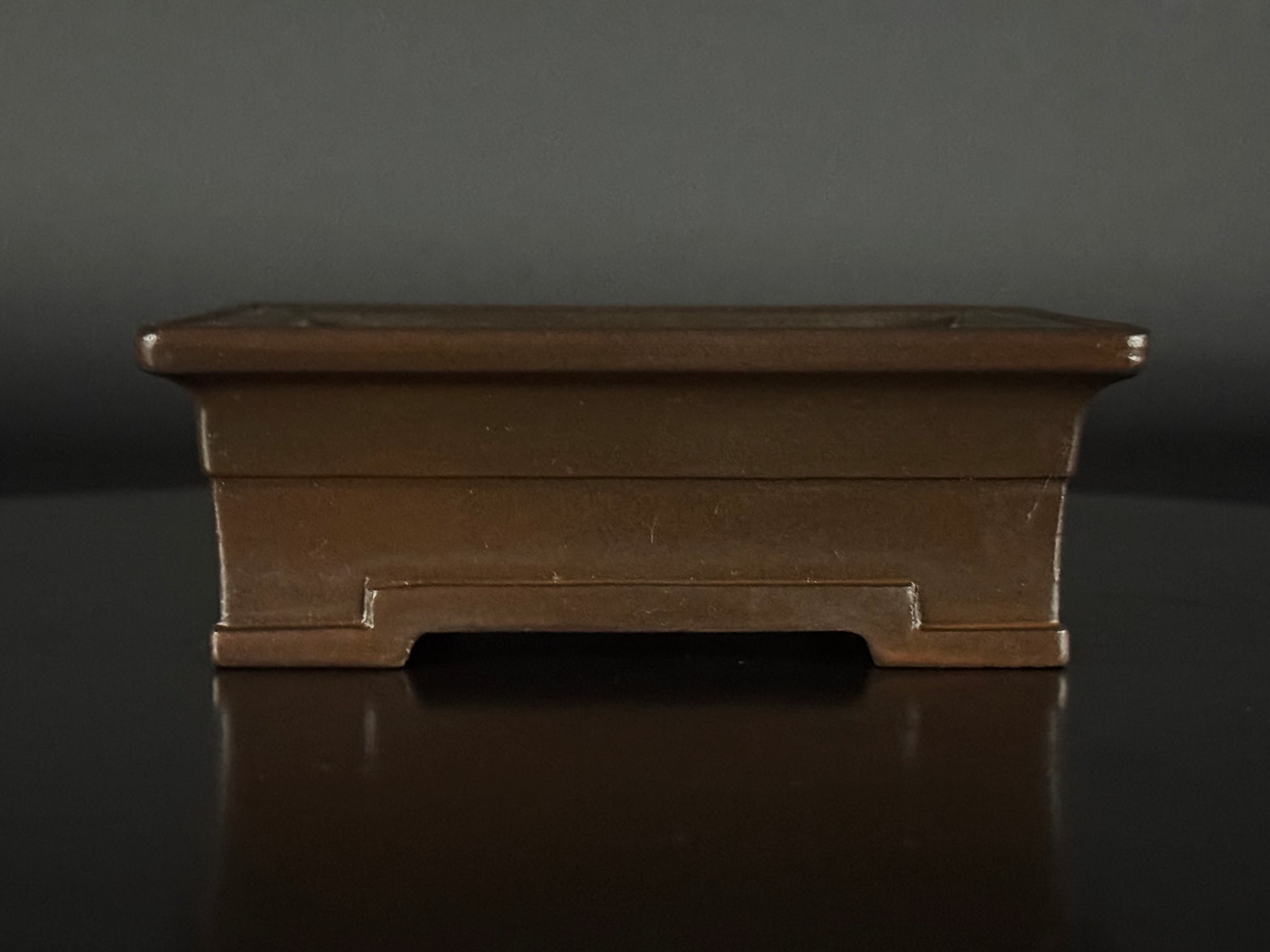 An amazing Shohin size (小品), unglazed rectangle features a very smooth raised lip that is finished, cloud feet slightly angled outwards and banding on the base, a style often associated with formality and strength, giving it lift and visual presence. The clay is the distinctive purple brown of the Tokoname area,