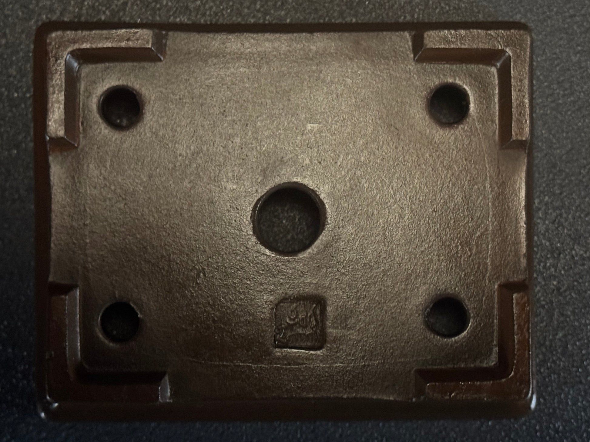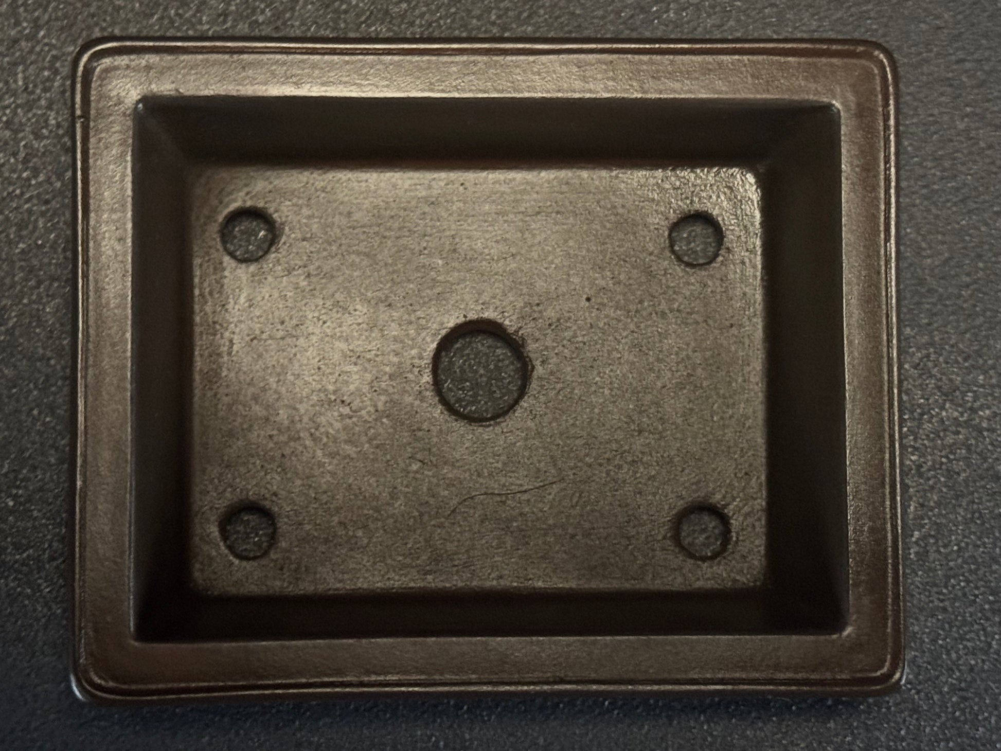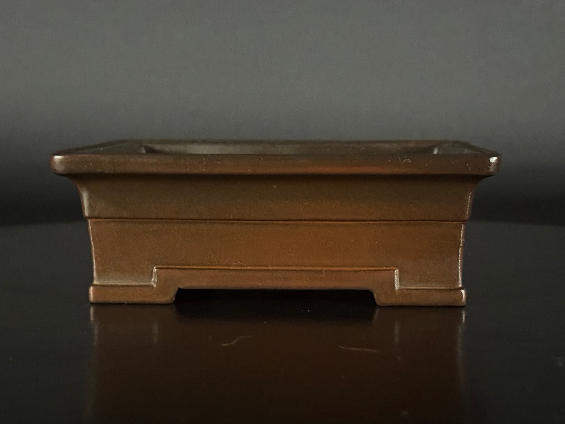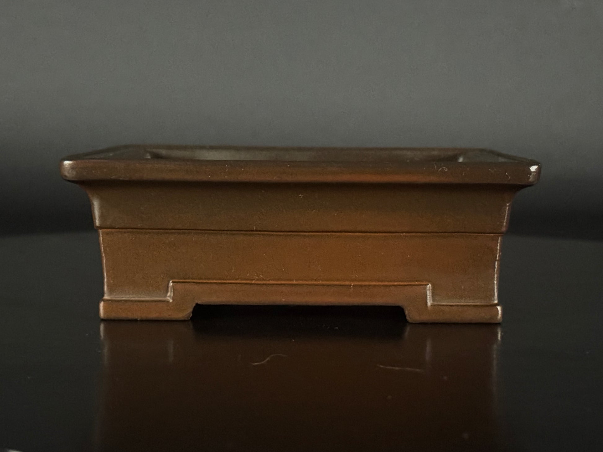 An amazing Shohin size (小品), unglazed rectangle features a very smooth raised lip that is finished, cloud feet slightly angled outwards and banding on the base, a style often associated with formality and strength, giving it lift and visual presence. The clay is the distinctive purple brown of the Tokoname area,