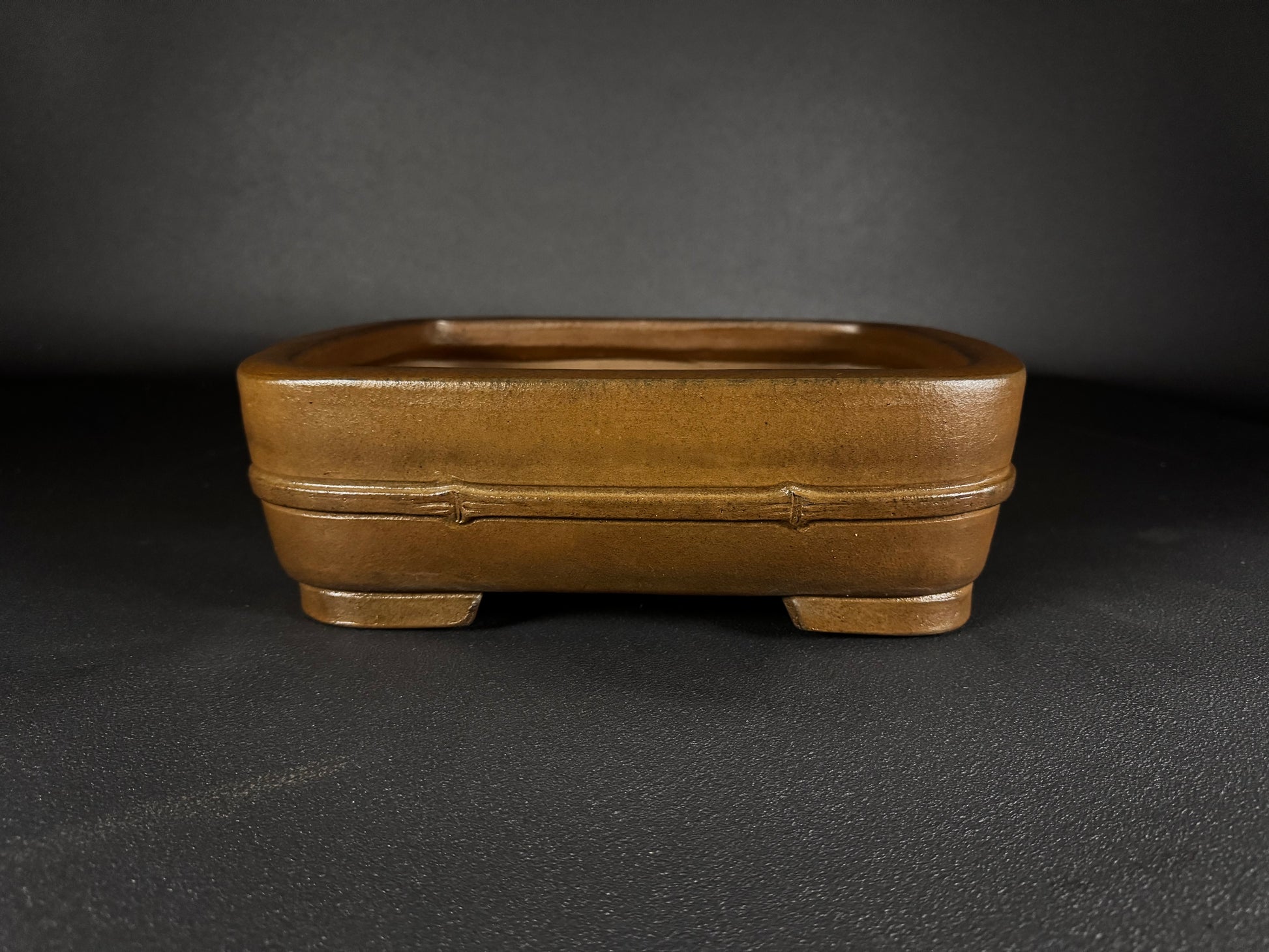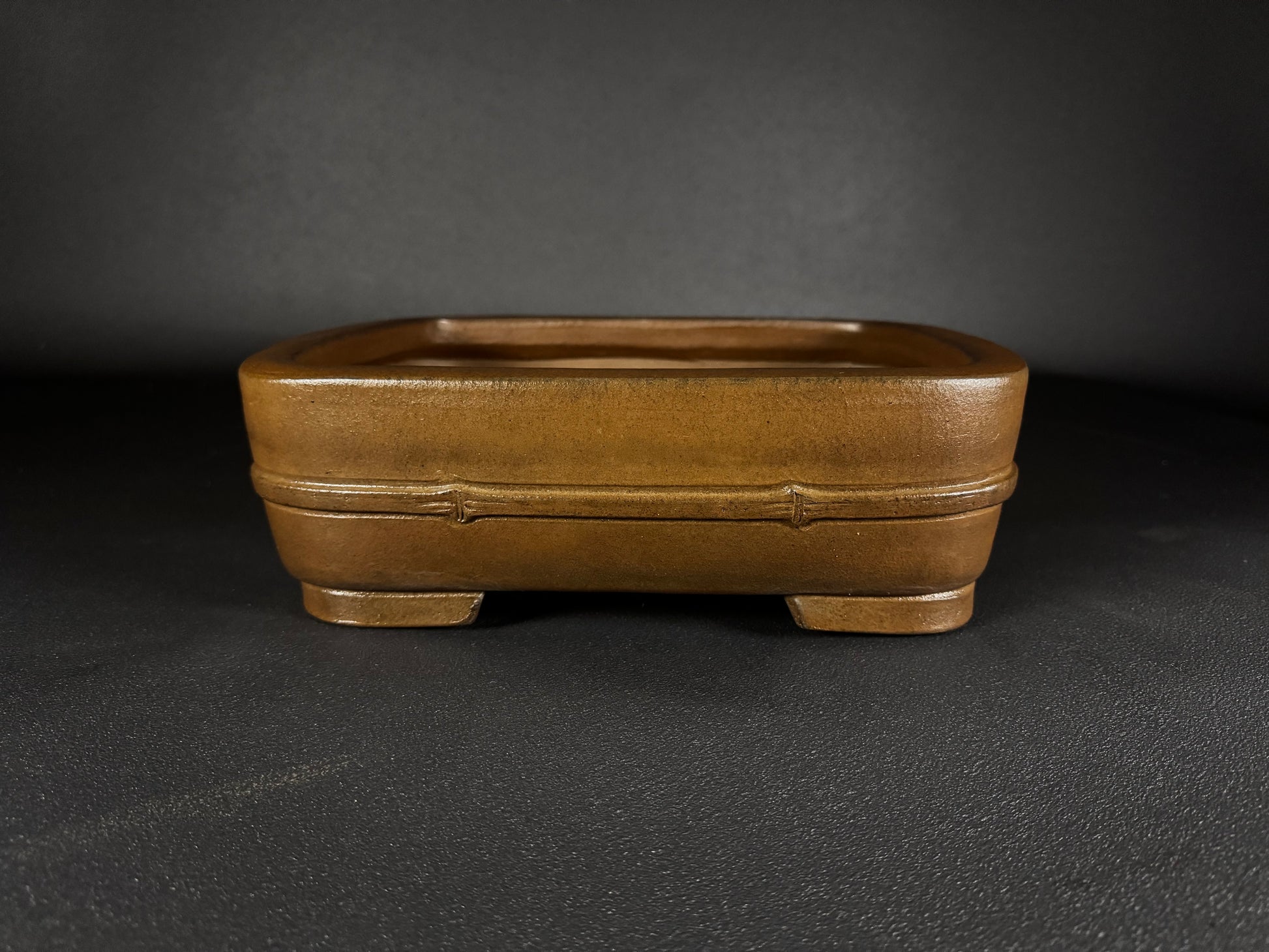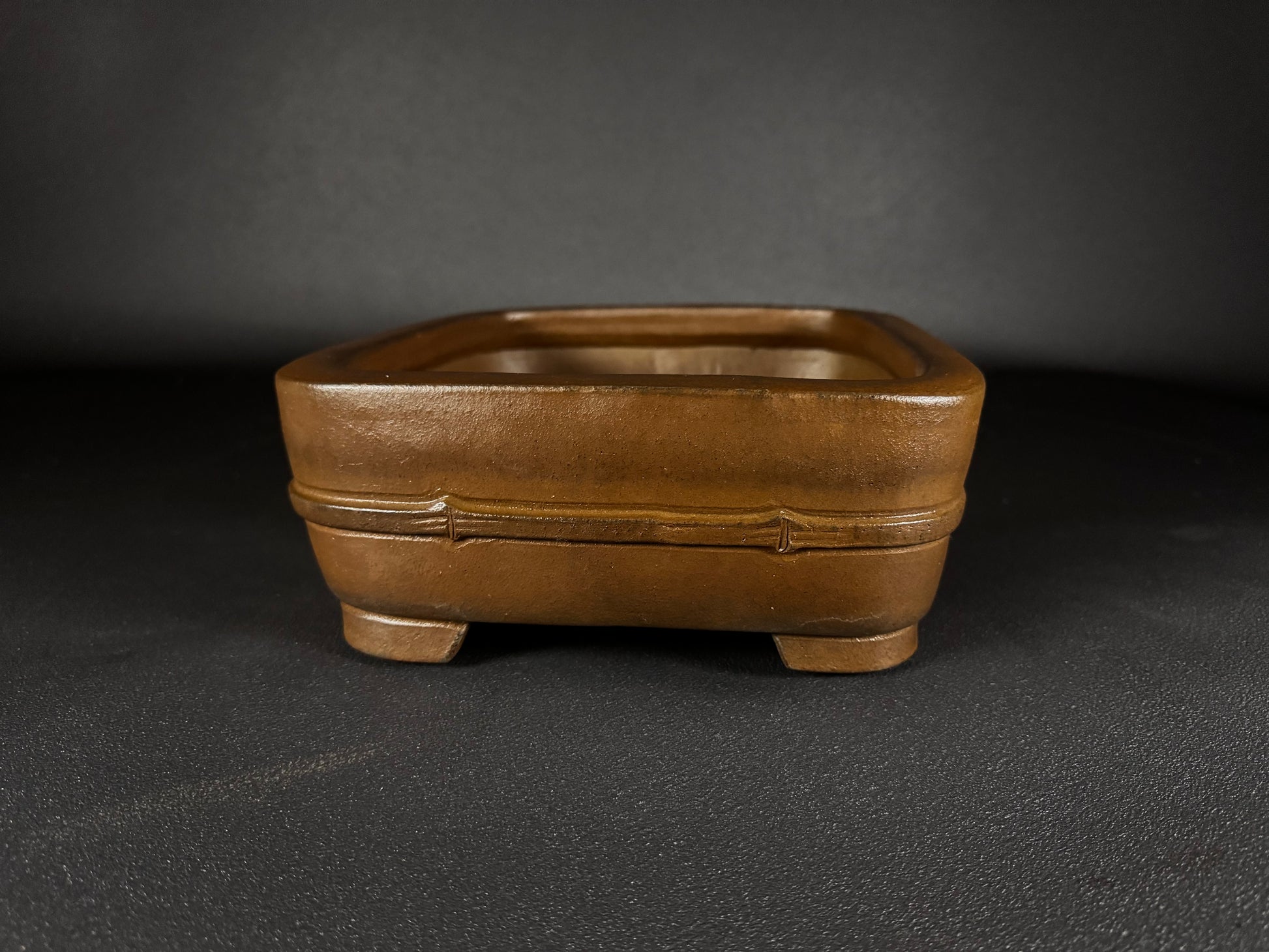 Handcrafted in Japan by SYU-ZAN, this unglazed rectangular bonsai pot features warm natural clay, A subtle bamboo-motif that encircles the midsection, adding a quiet decorative touch while maintaining the traditional aesthetic. The pot rests on short, sturdy corner feet, ensuring stability and proper drainage for healthy root development.