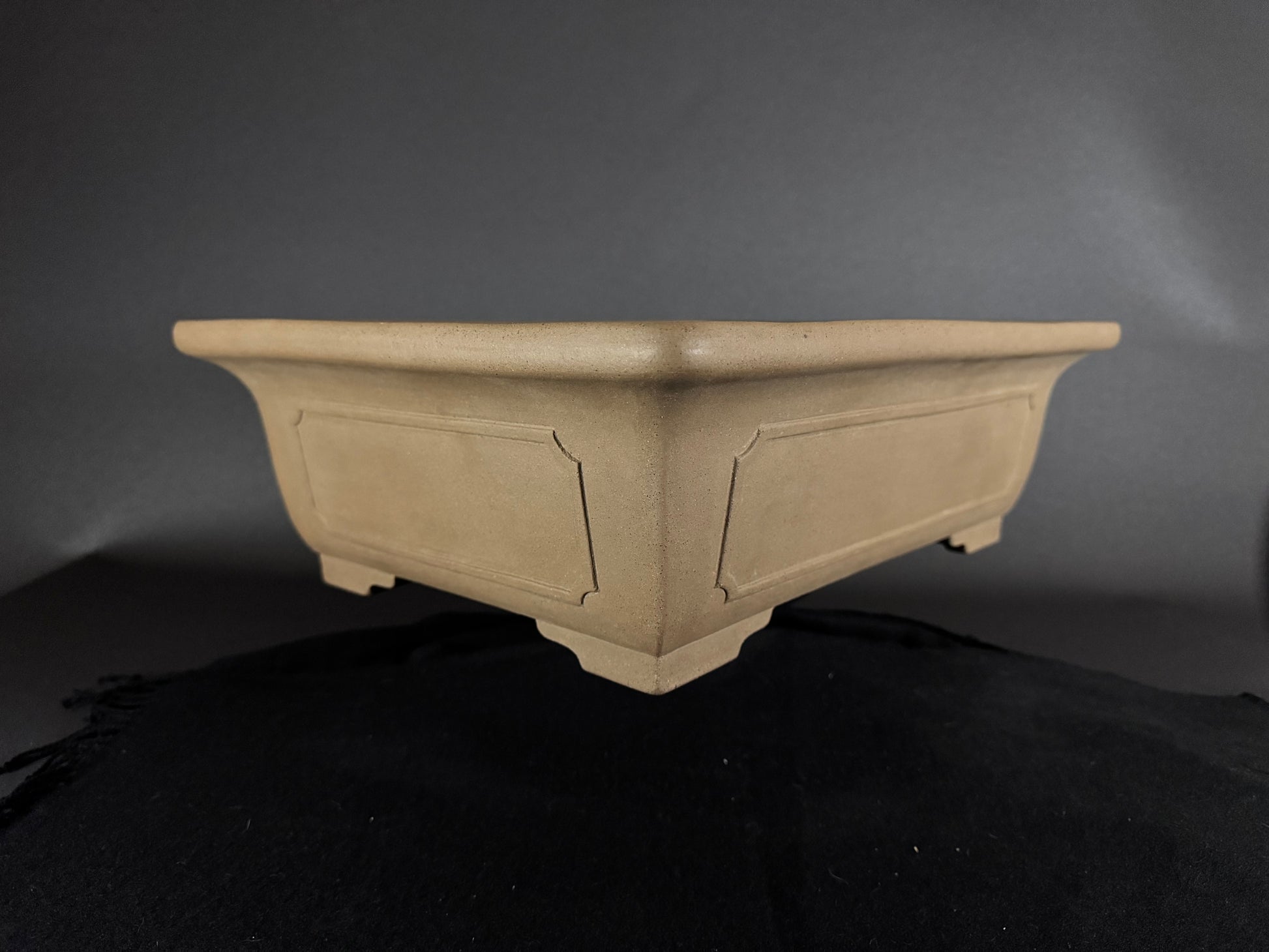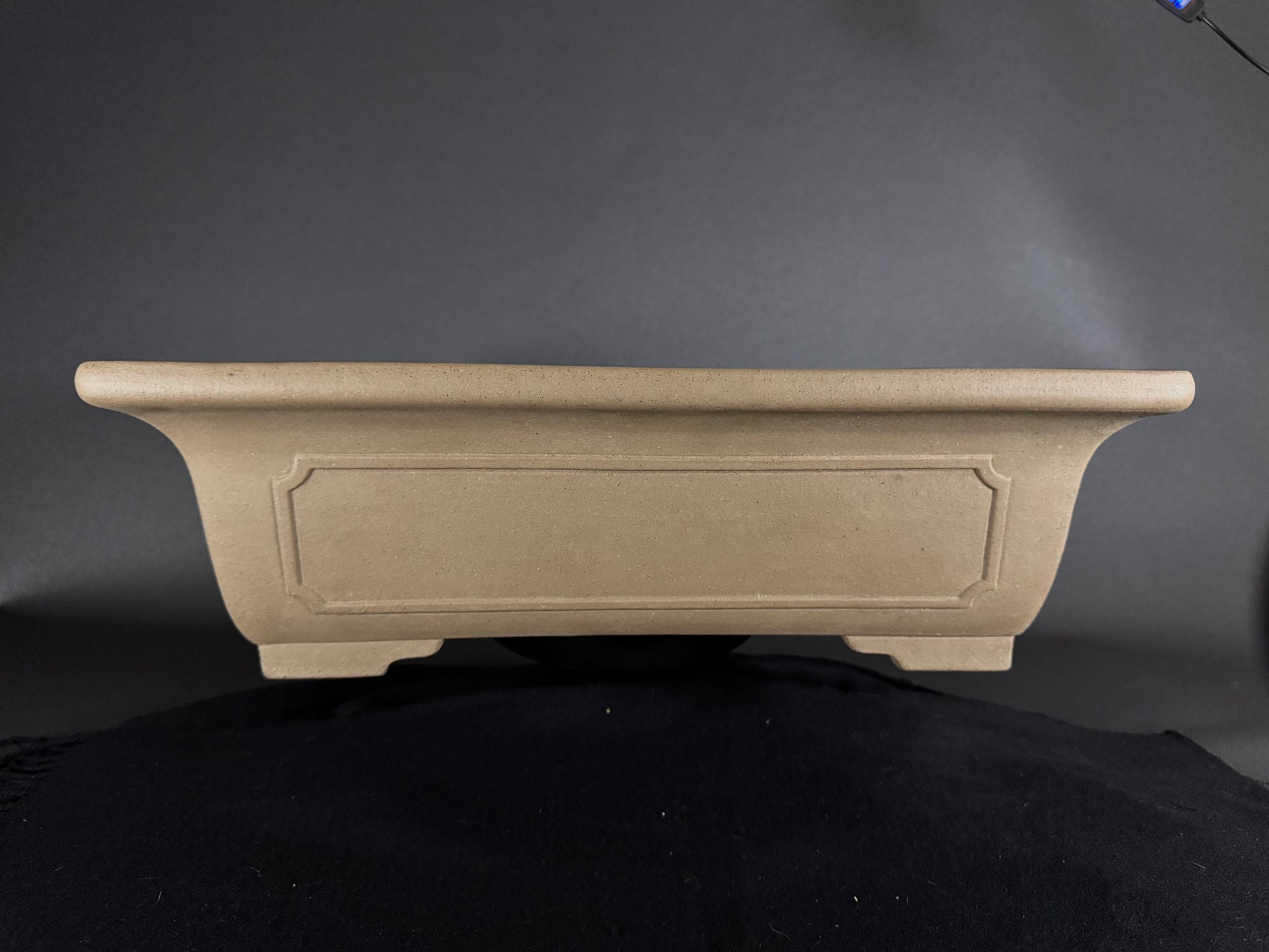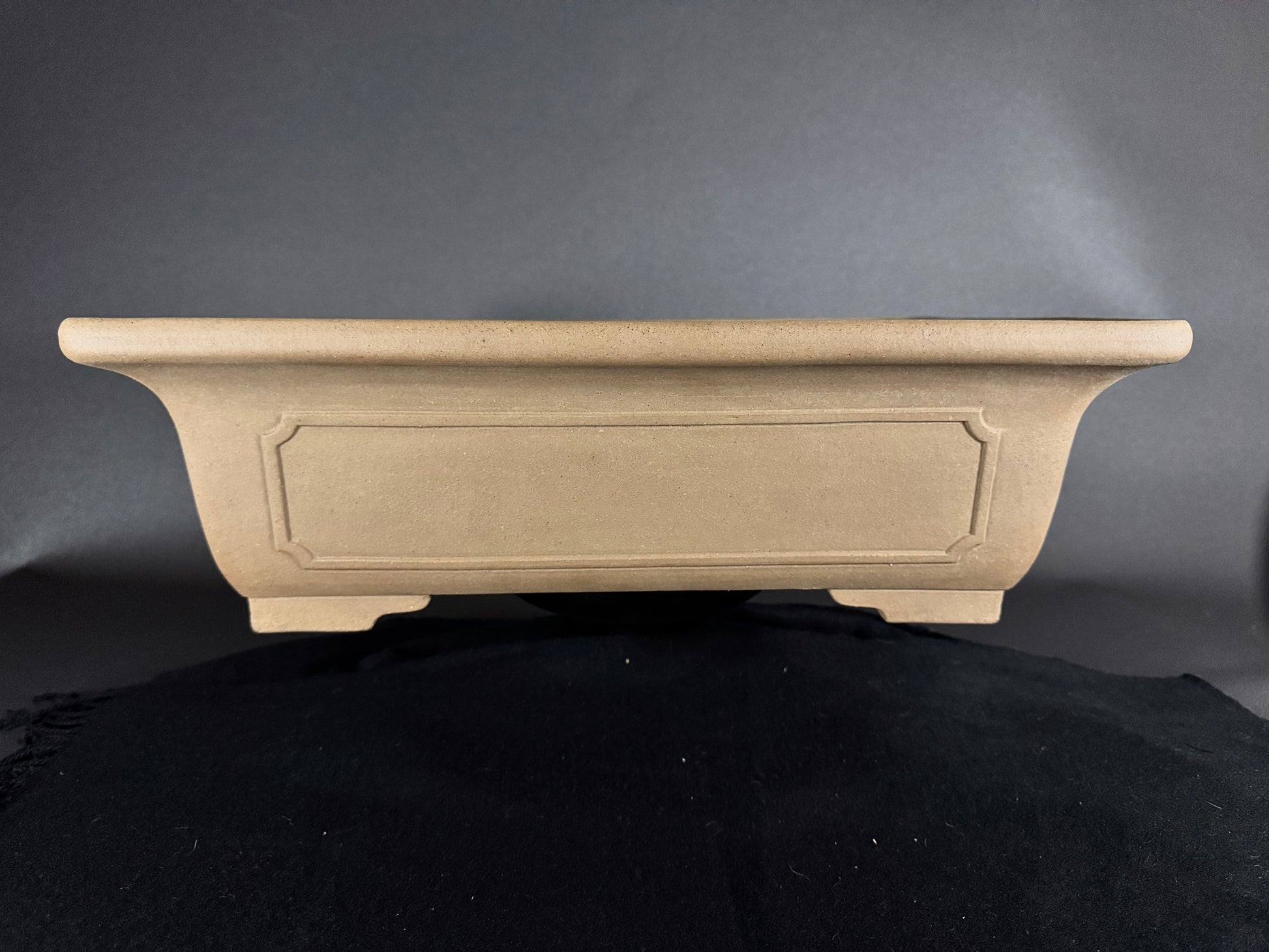 This 47cm rectangle is made from a Momo no hana, or peach blossom clay, in a traditional form. The pot sits on recessed stepped feet, and a slight lip to the rim, he has finished with a refined raised border, complementing the overall 'shibui' design. Note that each front and sides are decorated with a fine relief frame in a mokko design.