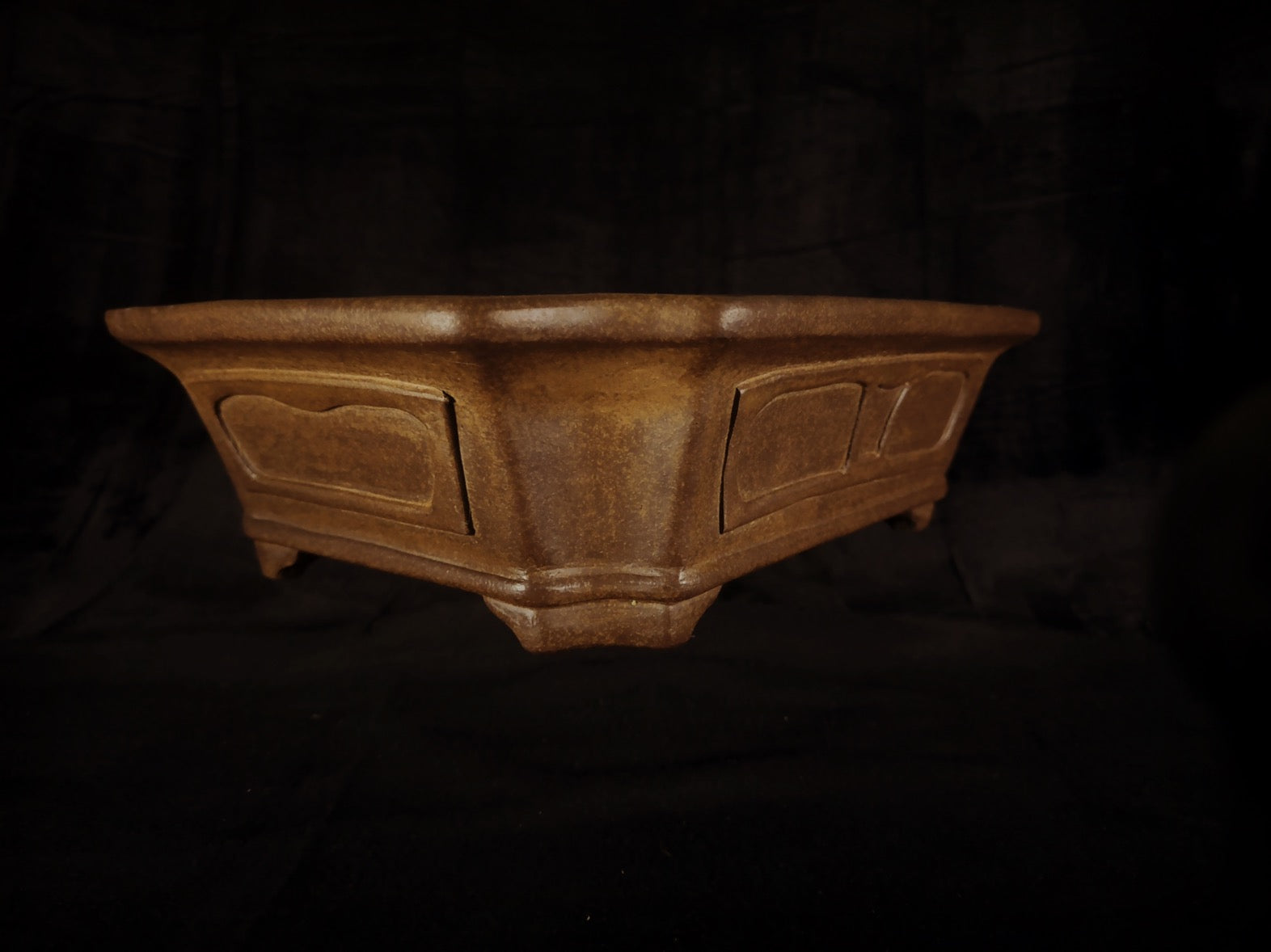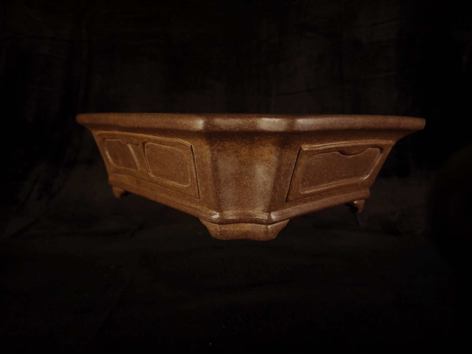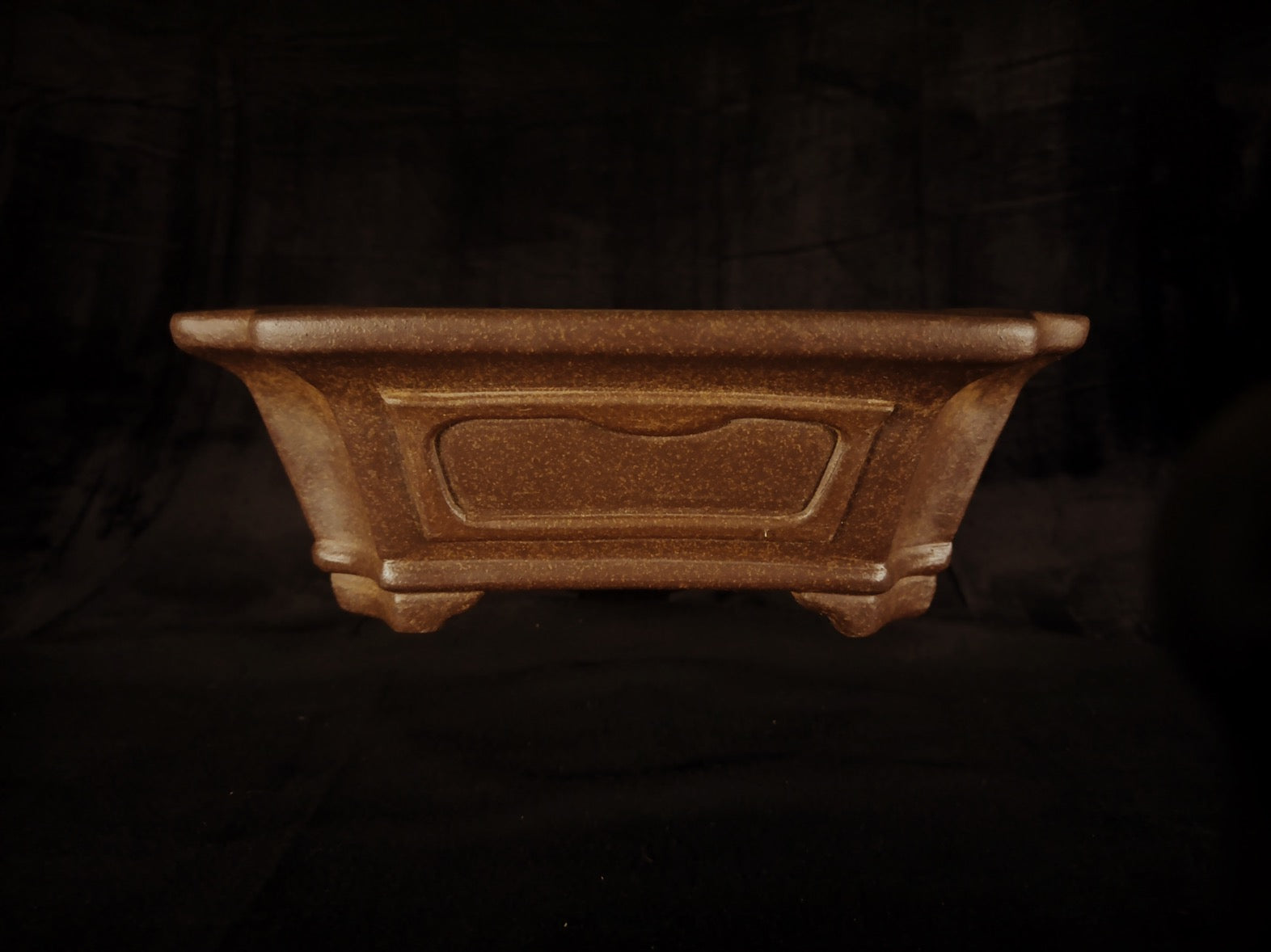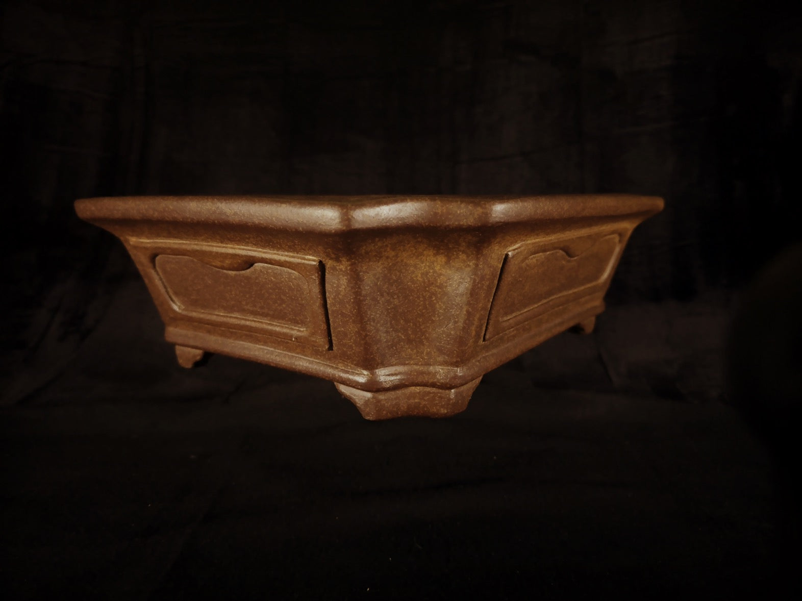A rare, large unglazed rectangle in a soft mokko design, hand-custom-made from one of Nakano's special mixed formulas of clays, features large corner cut, a lower band, quirky raised panels on all four sides, recessed stepped feet, with raised lip detail that is finished with a refined raised border, complementing the overall 'shibui' design.