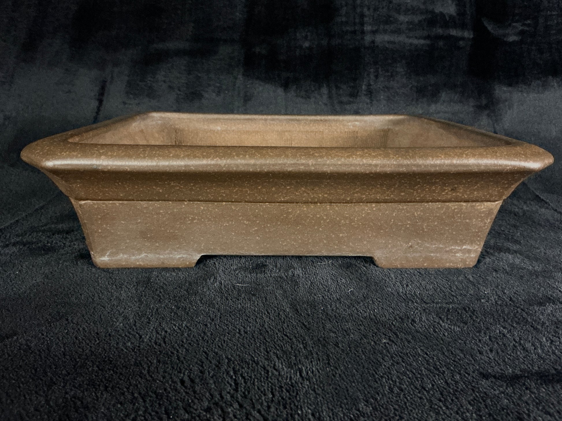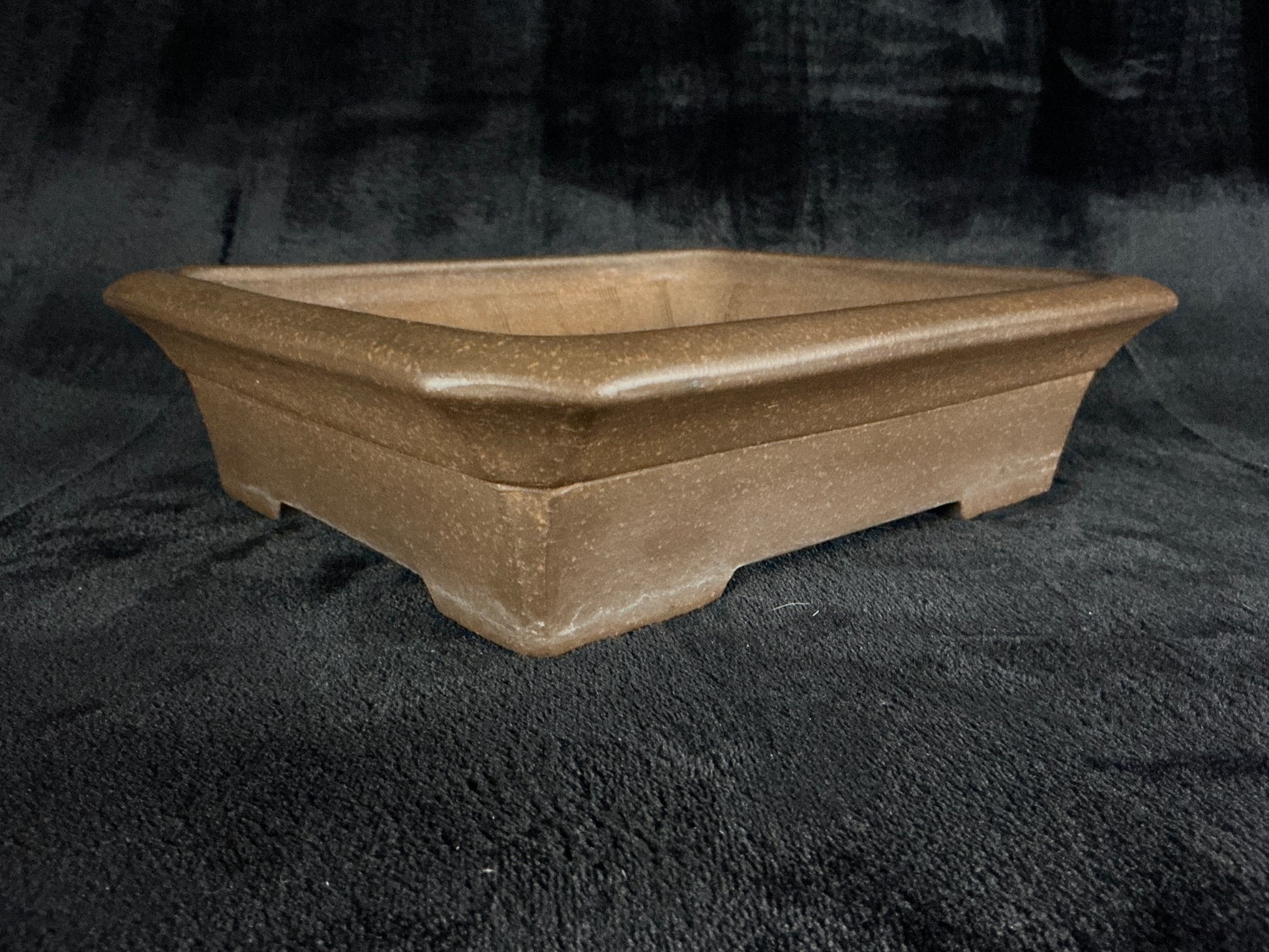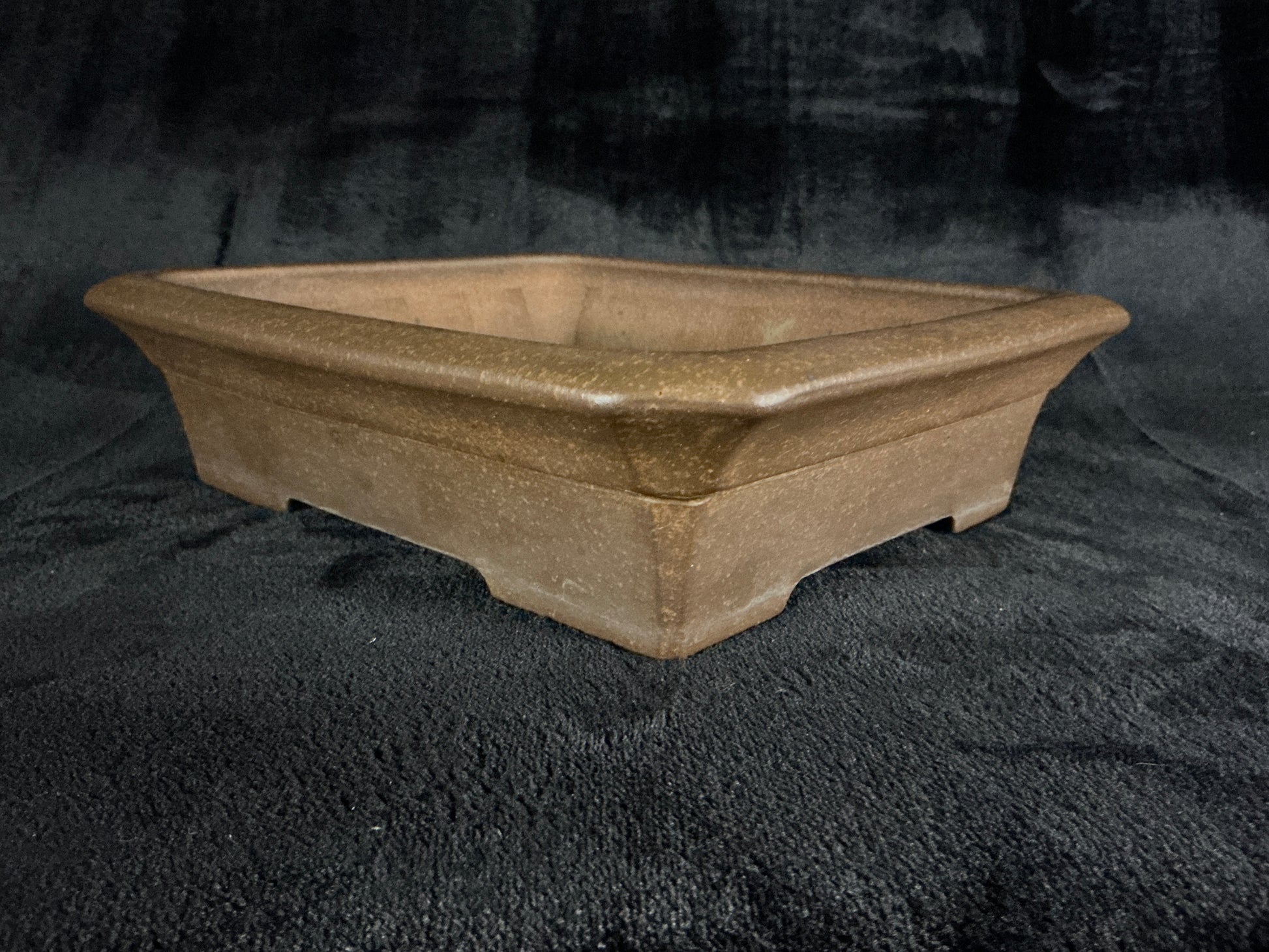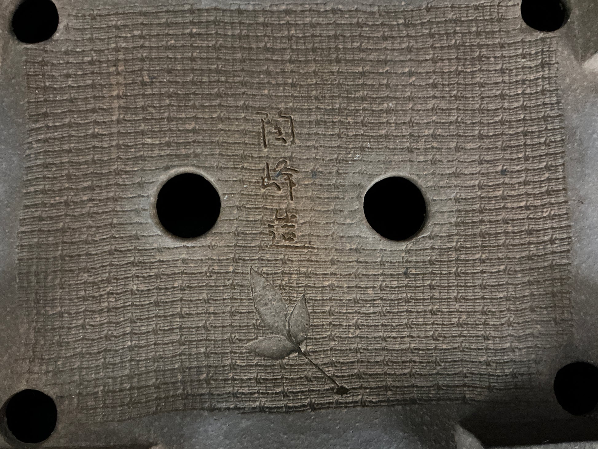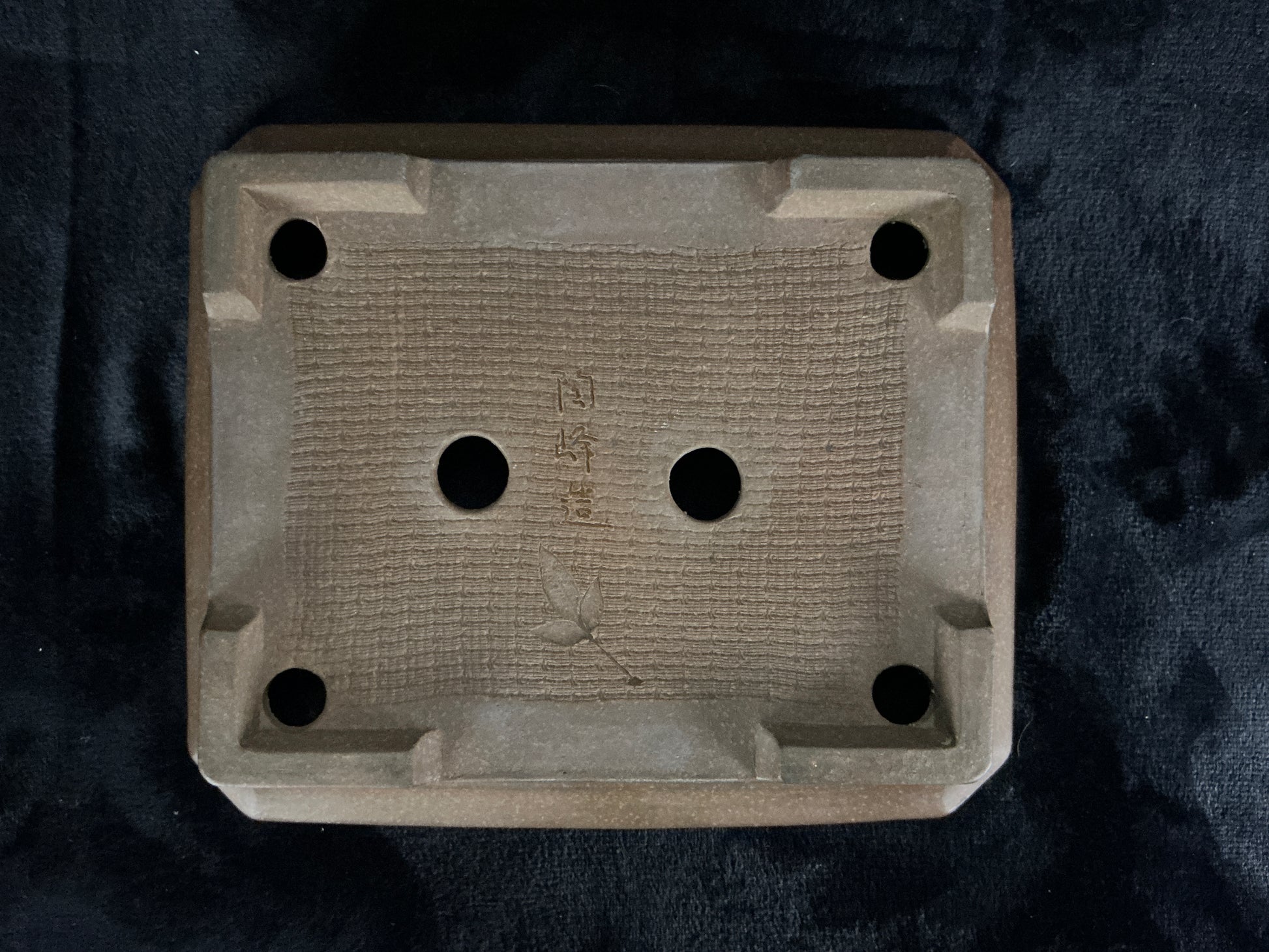 Bonsai pot from the Touhou (陶峰) kiln of Tokoname, rectangle, external rim, cut-off corners, horizontal band, and integrated feet. The size and shape are very practical; this is an excellent pot from a Tokoname potter. To the best of my knowledge, his pots are always nail-signed and often feature a leaf motif, such as this one.