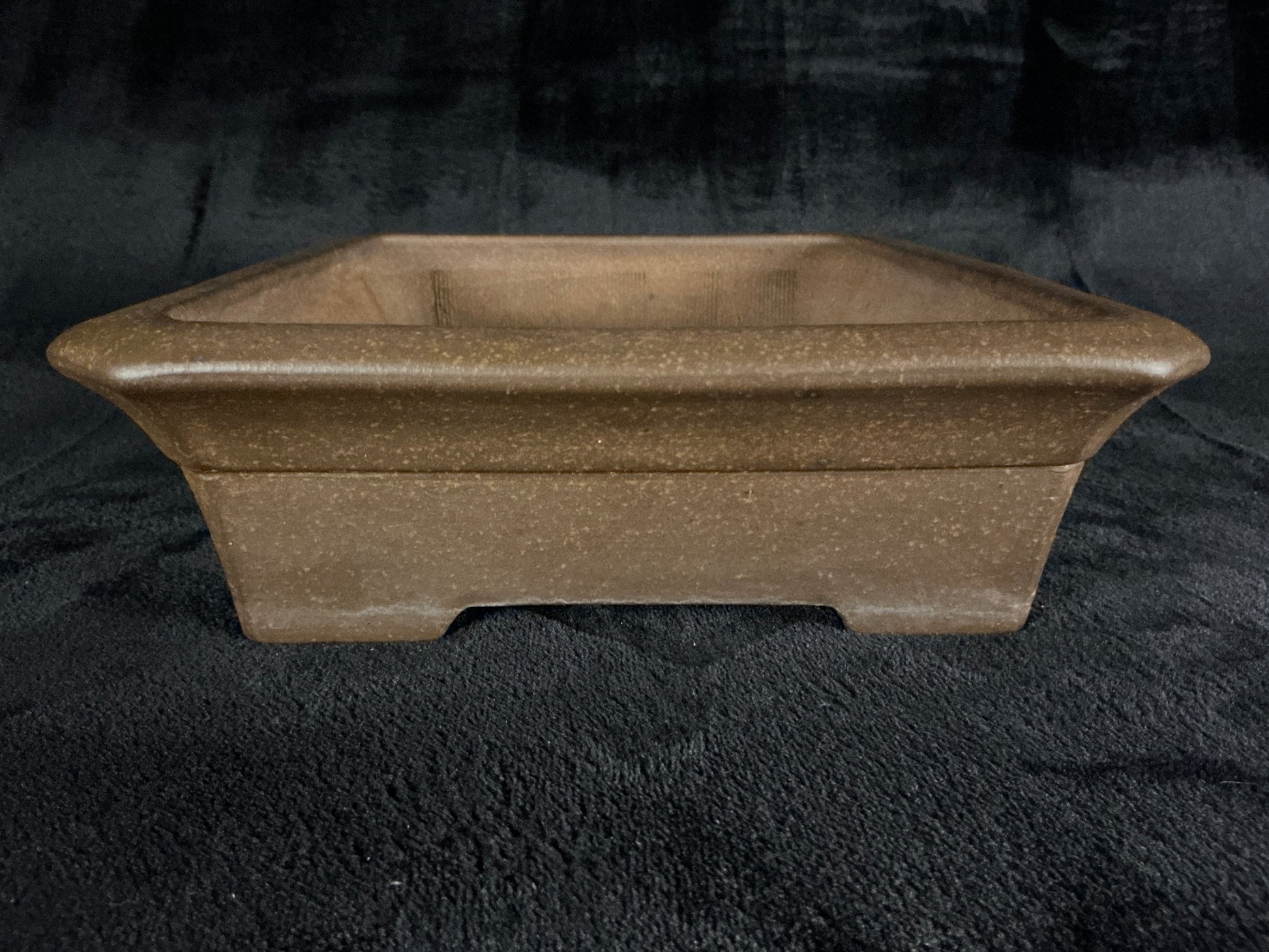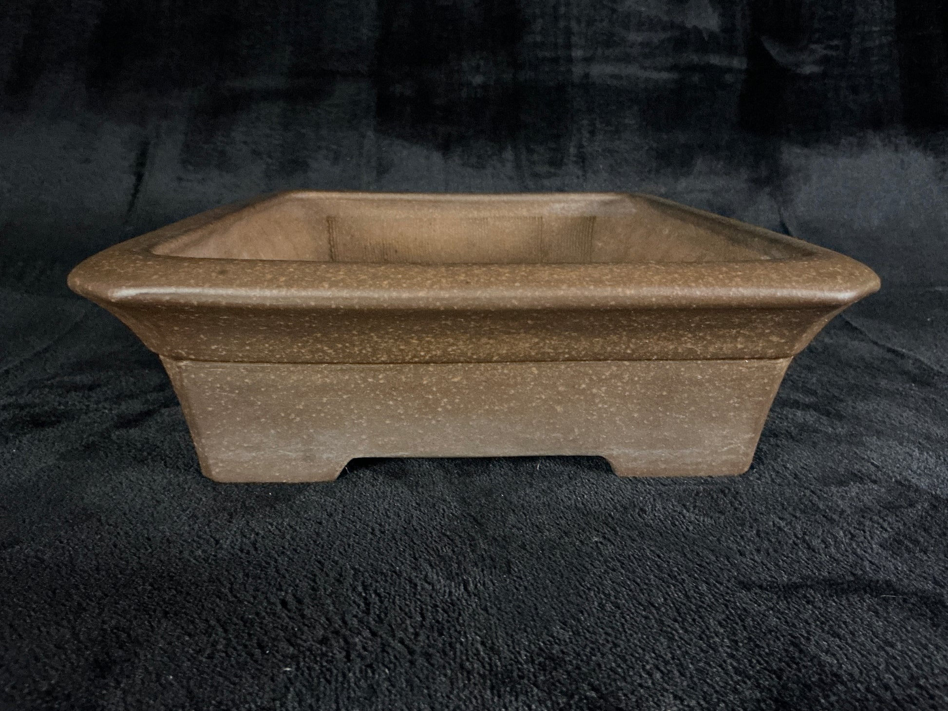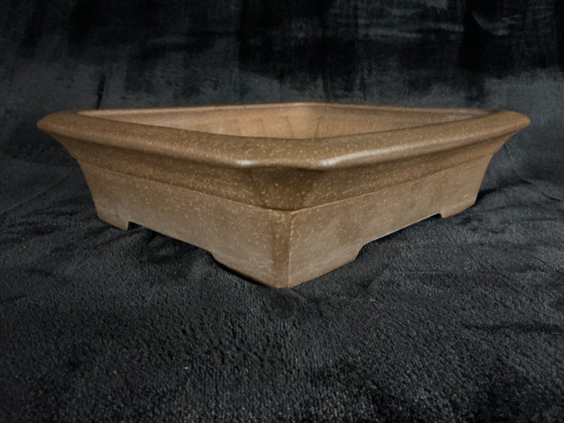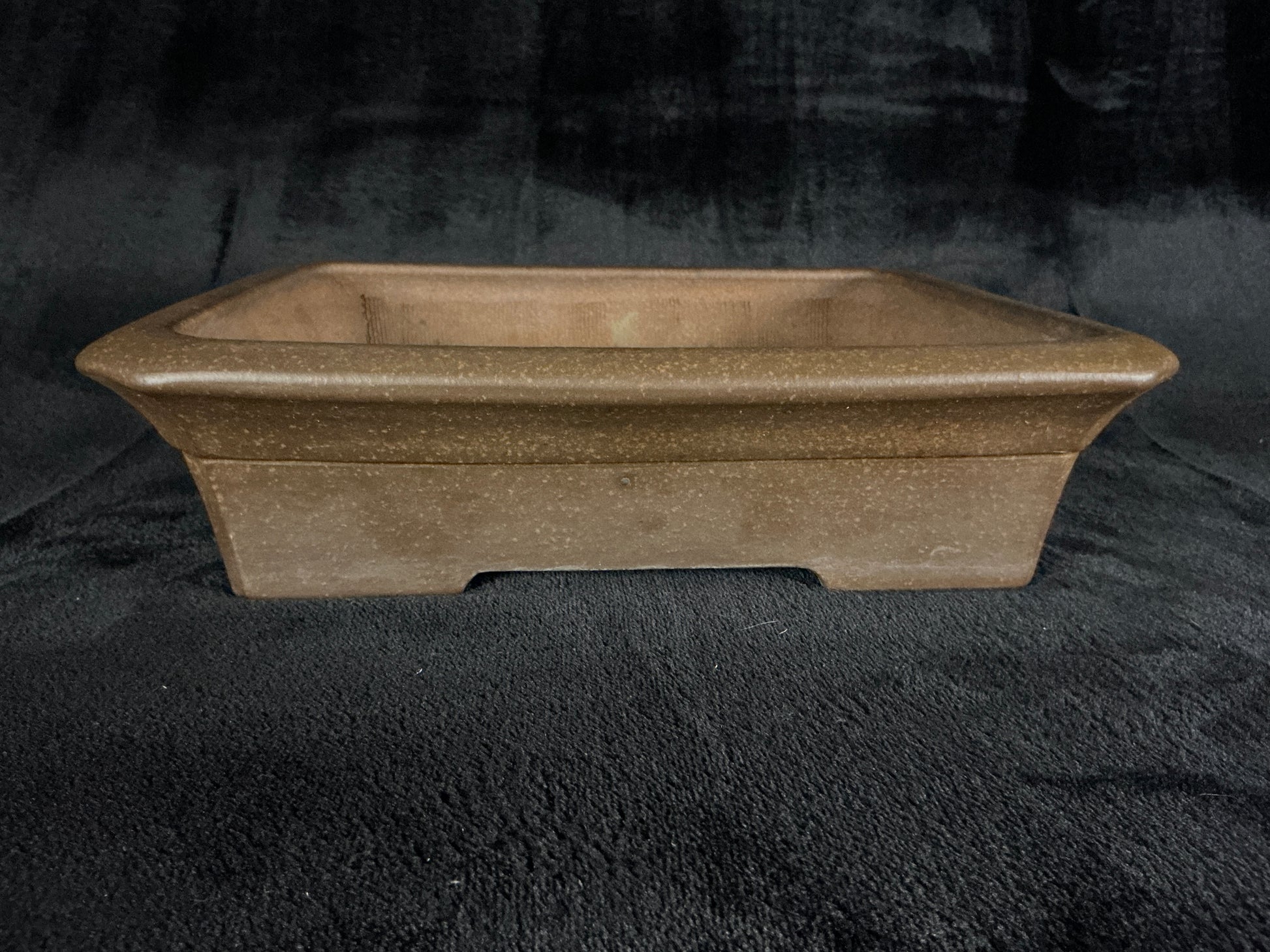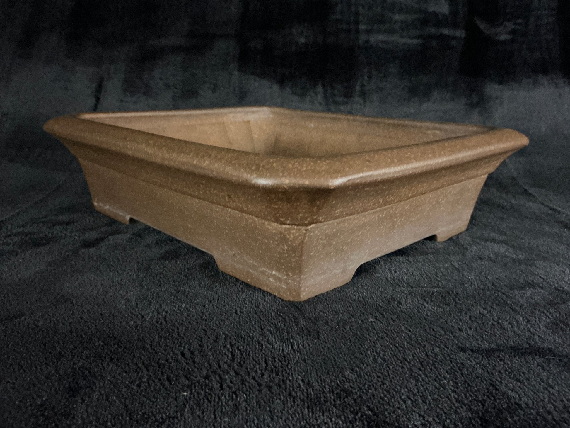 Bonsai pot from the Touhou (陶峰) kiln of Tokoname, rectangle, external rim, cut-off corners, horizontal band, and integrated feet. The size and shape are very practical; this is an excellent pot from a Tokoname potter. To the best of my knowledge, his pots are always nail-signed and often feature a leaf motif, such as this one.