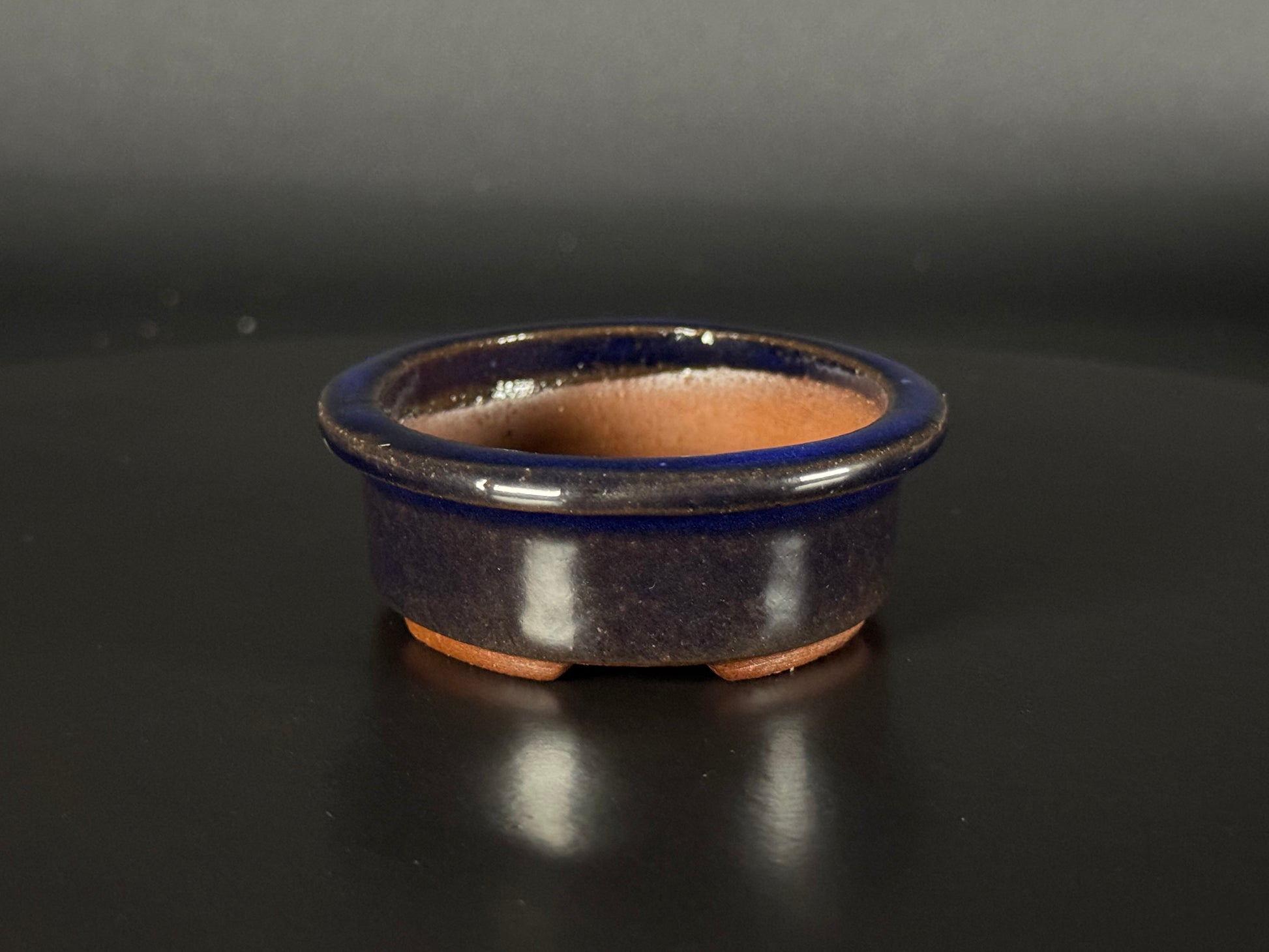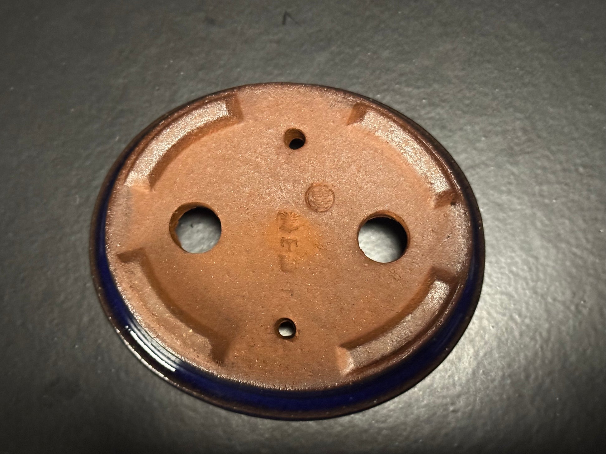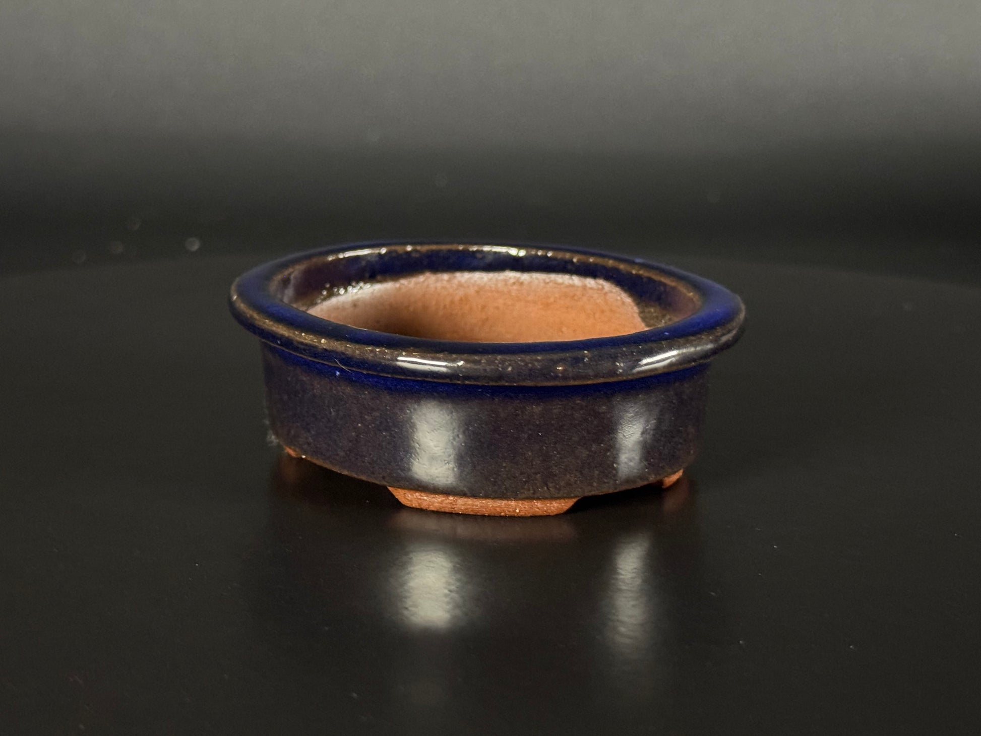 A refined mame-sized bonsai pot by esteemed Tokoname artist Eimei (英明), known for his award-winning glazes and lineage from the renowned Yōzan Kiln (耀山窯). The pot features an elegant oval form with a deep lapis lazuli glaze (瑠璃釉) on the upper section and a translucent band around the lower portion, subtly revealing the natural reddish Tokoname clay. This two-tone glazing creates a sophisticated contrast while showcasing the clay body beneath.